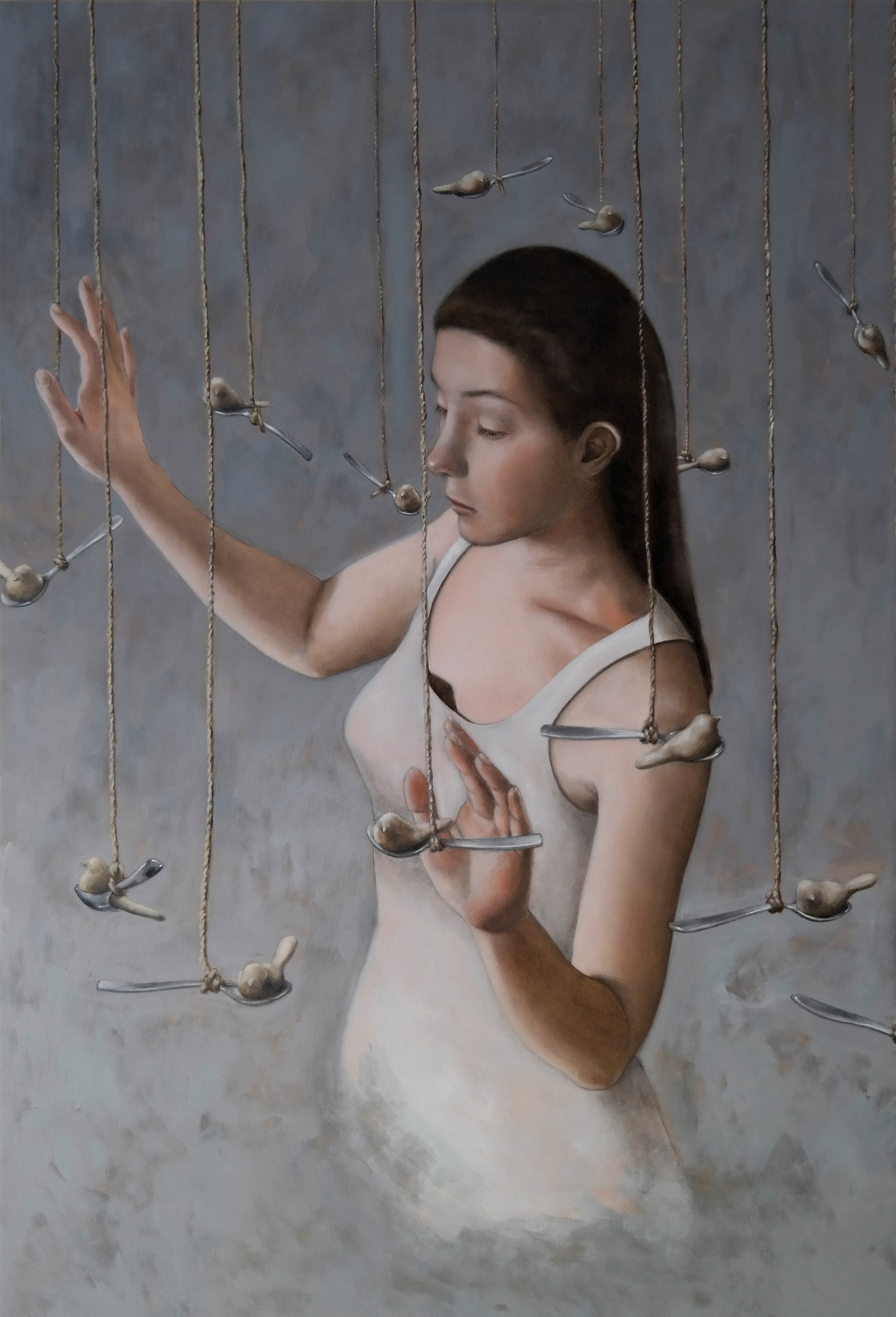 una tela si vede una figura femminile circondata da una dozzina di esemplari sospesi,