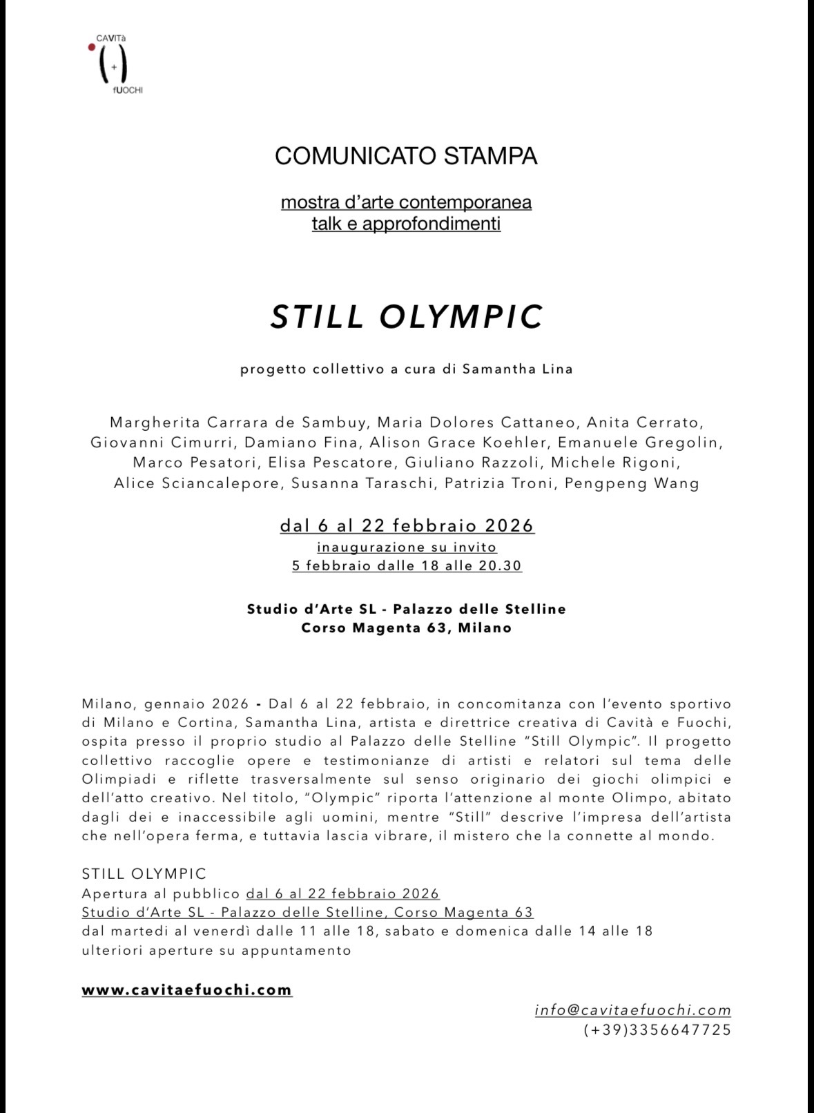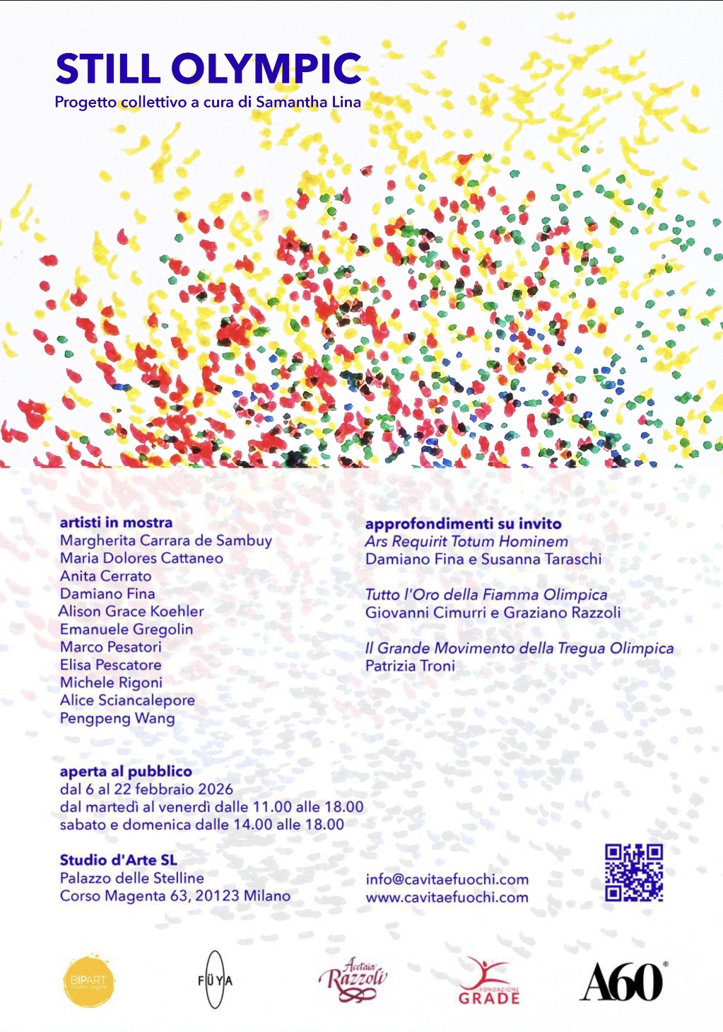 Dal 6 al 22 febbraio, in concomitanza con l’evento sportivo di Milano e Cortina, Samantha Lina, artista e direttrice creativa di Cavità e Fuochi, ospita presso il proprio studio al Palazzo delle Stelline “Still Olympic”. Il progetto collettivo raccoglie opere e testimonianze di artisti e relatori sul tema delle Olimpiadi e riflette trasversalmente sul senso originario dei giochi olimpici e dell’atto creativo. Nel titolo, “Olympic” riporta l’attenzione al monte Olimpo, abitato dagli dei e inaccessibile agli uomini, mentre “Still” descrive l’impresa dell’artista che nell’opera ferma, e tuttavia lascia vibrare, il mistero che la connette al mondo.