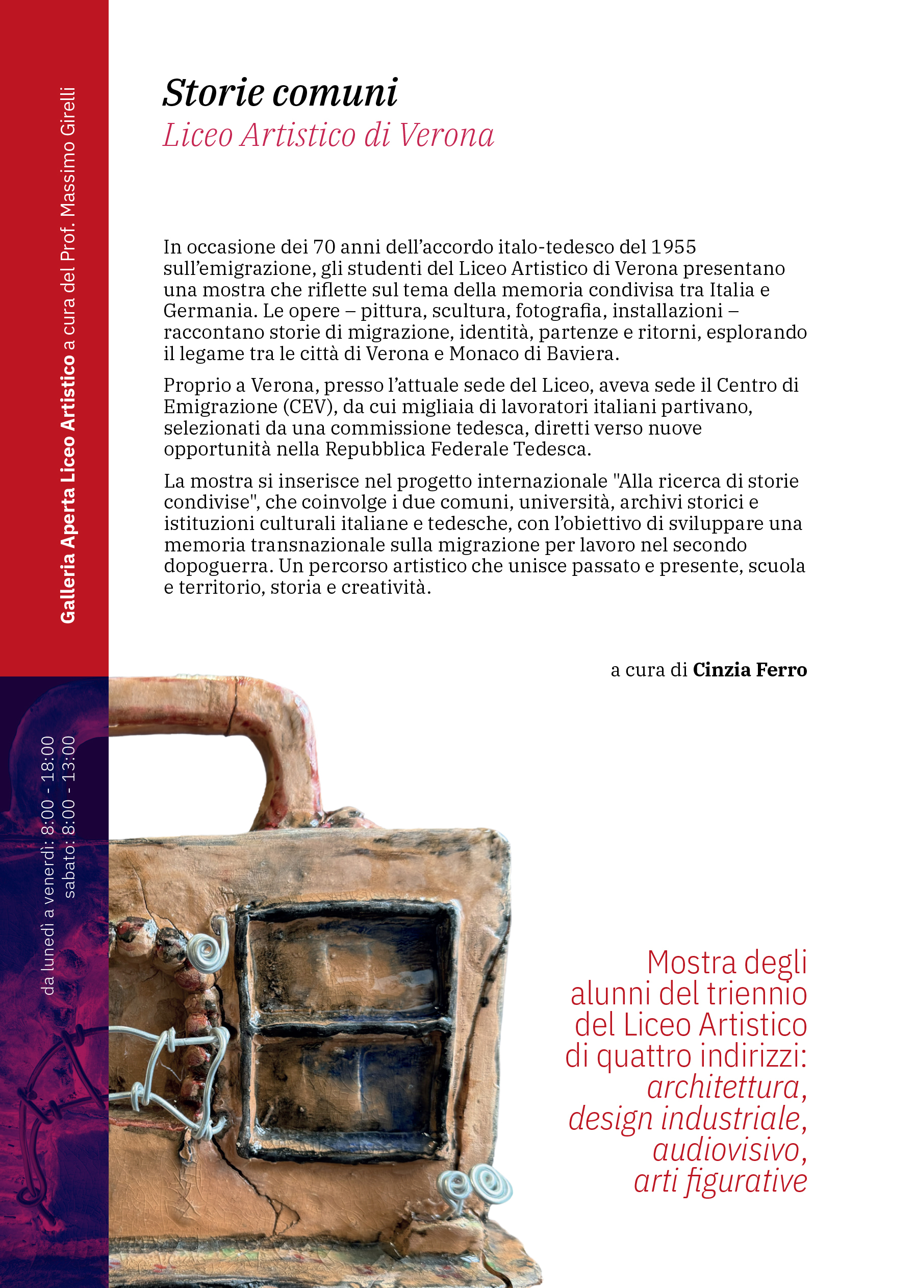 In occasione della 70ª ricorrenza dell’accordo italo-tedesco del 20 dicembre 1955, il Liceo Artistico Statale di Verona presenta Storie comuni, una mostra collettiva degli studenti, ospitata negli spazi della Galleria Aperta Liceo Artistico, nell’ambito del Progetto Istituzionale "Come eravamo".
