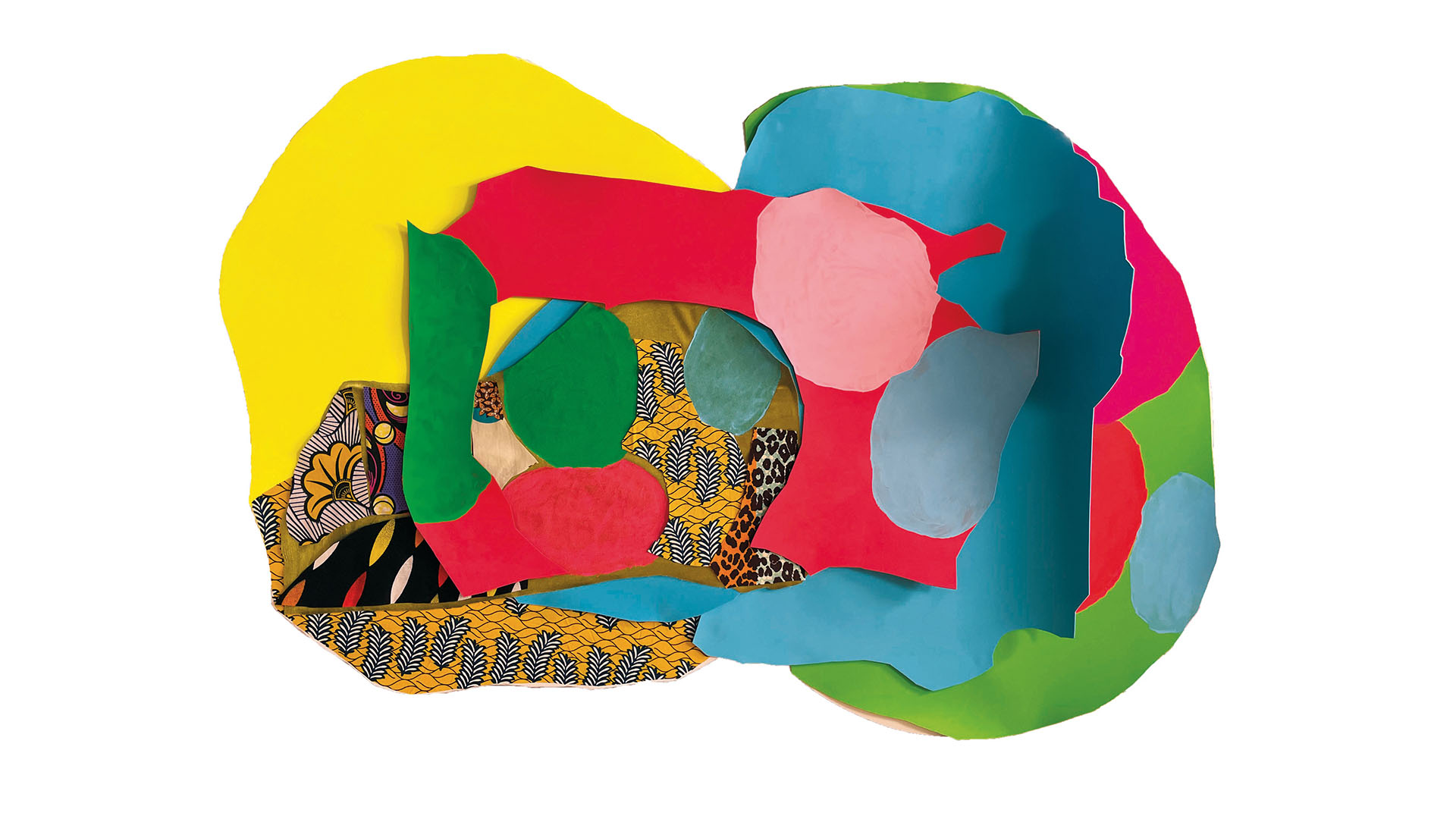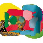 I colori accostati al di fuori di accordi cromatici classici, la scelta di dipingere su una gomma i tessuti wax, i contorni tagliati su linee incurvate e spezzate mostrano uno stridore, caratteristica del lavoro dell’artista, un diverso mostrarsi della bellezza, senza armonia.