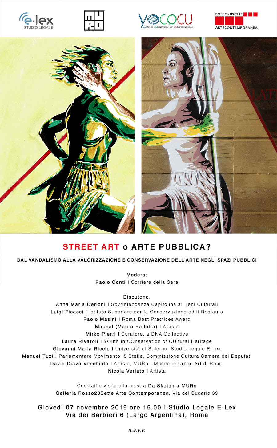 Organizzato da E-Lex e il MURo (Museo di Urban Art di Roma), in collaborazione con YOCOCU (YOuth in COnservation of CUltural Heritage) e con la galleria Rosso20sette Arte Contemporanea, l’incontro permetterà agli ospiti di affrontare e valutare assieme le tematiche più calde che gravitano attorno all'Arte Urbana.
