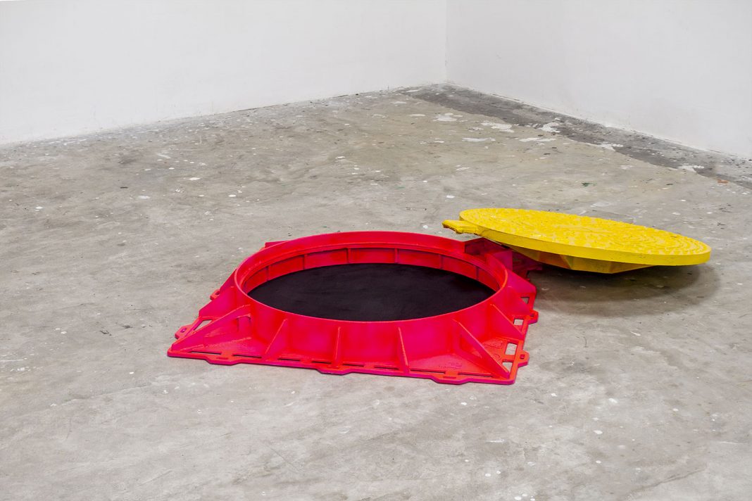 Nella mostra pensata per gli spazi di A PICK GALLERY si riversano così elementi sottratti dalla realtà, normalmente presenti nelle strade e nei cantieri. Oggetti che raccontano una storia che abbiamo già visto, letto, memorizzato, attraverso cartelli stradali e segnaletica varia, strisce pedonali che abbandonano l’asfalto e si accavallano, tombini e materiali di imballo. Una cartolina di un intero quartiere che si scompone e si sposta tra i muri bianchi della galleria.