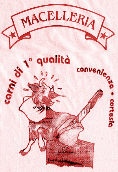 In continuità coi suoi lavori in cui aveva già affrontato il problema dell’estetica dei bisogni (Pasticcerie umbre, Progetto Iubris e le Insegne di Farmacia, queste ultime presentate alla Galleria Gallerati nel 2010), Piacentini mette oggi in mostra gli ultimi residui, apparentemente innocenti, di questo commercio: i vari tipi di carta usata per confezionare i tagli di carne nelle botteghe, veli che vogliono nascondere il sangue e il dolore, e per questo stampati frequentemente con un tono sbiadito di rosso, quasi a voler mischiare fra loro marchi logori e ferite recenti. Su queste carte resistenti, ma pensate per durare poco, l’impronta del macellaio – confusa tra segni e disegni – rappresenta la firma più inquietante di questa indifferenza esibita verso il mondo della vita, verso la famiglia animale da cui discendiamo e a cui, in fondo, noi stessi apparteniamo. Come non pensare che questa indifferenza non finisca per inquinare anche i rapporti tra gli uomini?