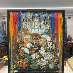 Pollution Art – Marco Lombardi apre il percorso con nove opere monumentali realizzate su quadri da stampa (buratti), tra cui La Forza della Natura, Volo Sommerso, La Voce del Tropico, Red Lacewing, Papilio Machaon, Eden Corrotto, Verde Contaminato, Veleni in Fiore e Magma. Opere che trasformano matrici industriali dismesse in strumenti espressivi, con una riflessione potente su ambiente, rigenerazione e sostenibilità. L’opera centrale, La Forza della Natura, raffigura una tigre che si erge fiera contro le colate di colore tossico che alludono all’inquinamento, simbolo della resilienza della natura di fronte alle azioni distruttive dell’uomo.