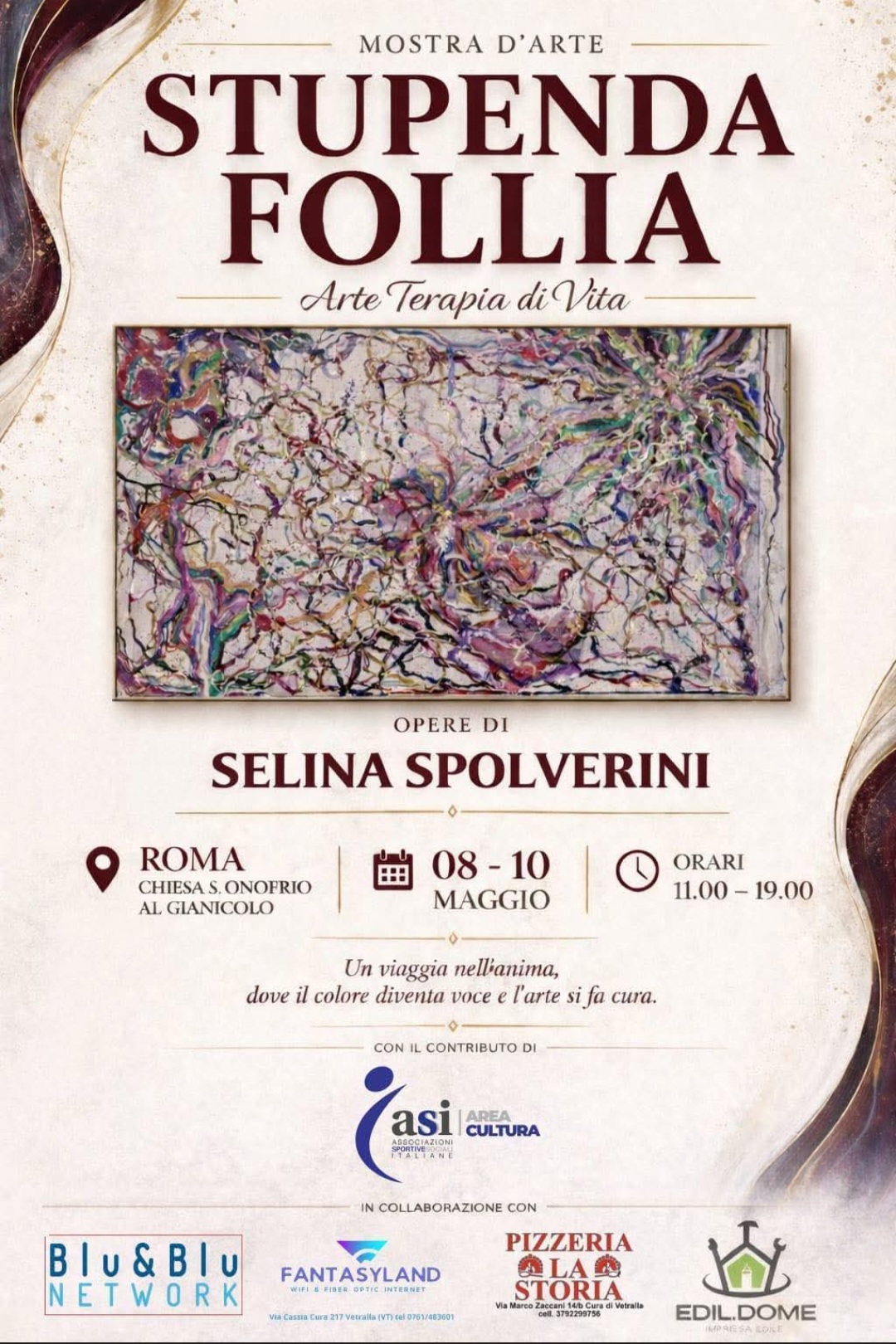 Nel cuore silenzioso del Gianicolo, dove Roma si affaccia sul cielo e la pietra custodisce secoli di preghiera, nasce “Stupenda follia” Arte terapia di vita, una mostra che trasforma il Chiostro della Chiesa di Sant’Onofrio in un ponte simbolico tra arte e speranza. Un luogo che diventa spazio di ascolto, di meditazione e di rinascita, dove la luce incontra la fragilità e la trasforma in visione.