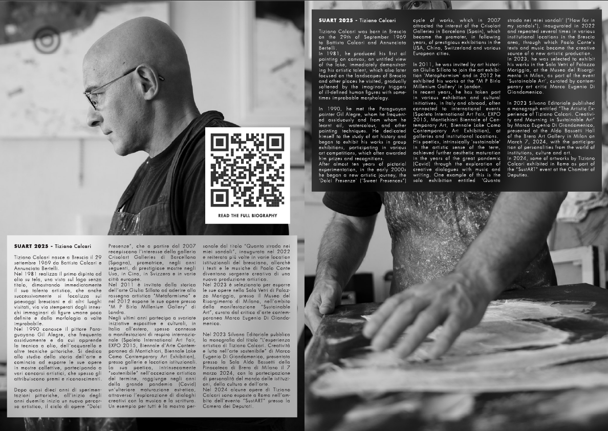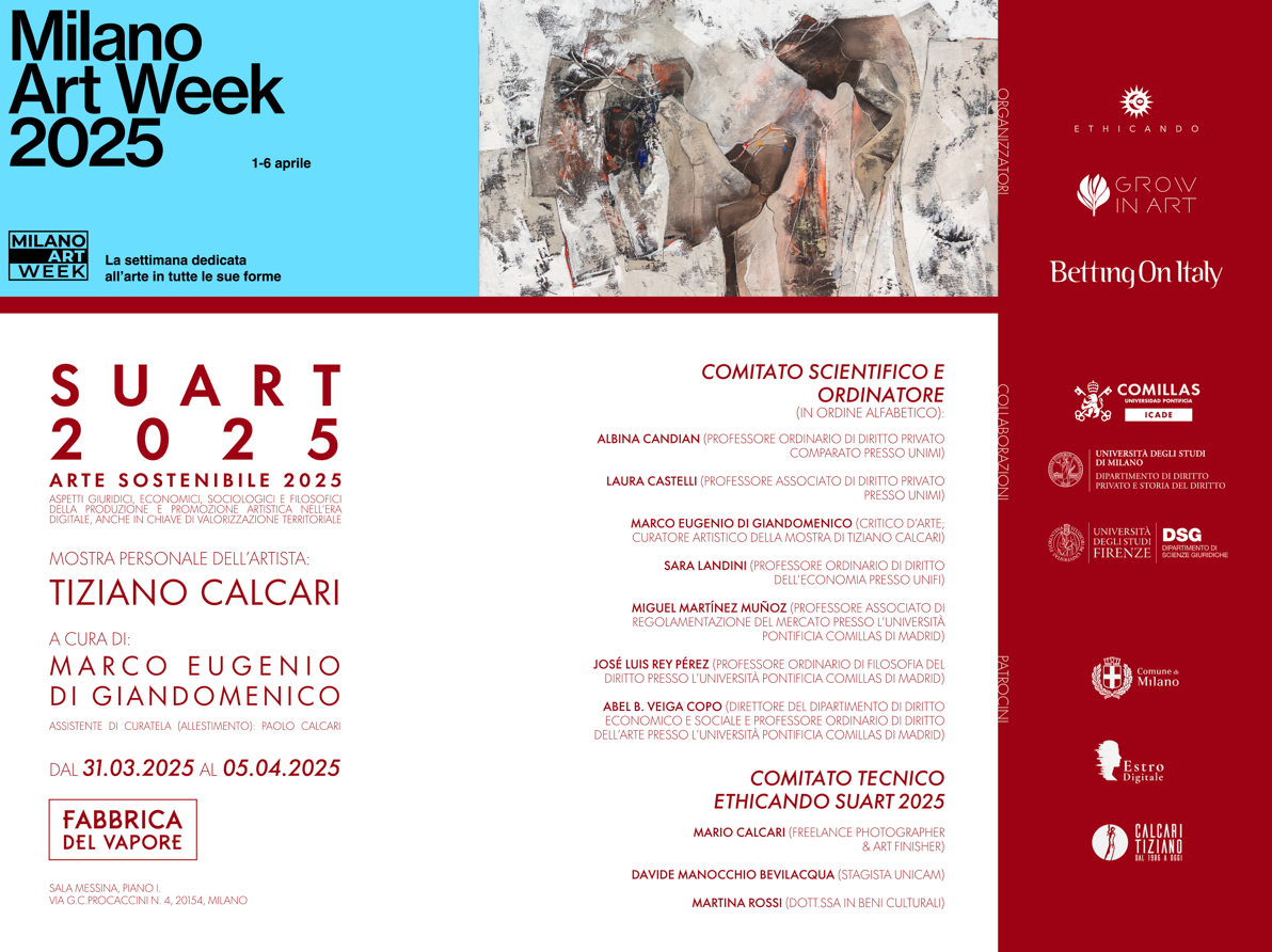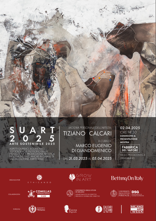 Dal 31 marzo al 5 aprile 2025, nell’ambito degli eventi di MILAN ARTWEEK 2025, presso La Fabbrica del Vapore di Milano (Sala Messina, I piano), Ethicando Association organizza l’evento SUART 2025, mostra personale di Tiziano Calcari, con la curatela artistica di Marco Eugenio Di Giandomenico.
