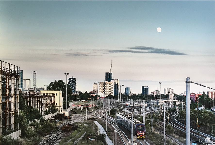 Matteo Cirenei (1965) fotografa la stazione di Cosenza – opera di ingegneria di Nervi – e lo scheletro della stazione di San Cristoforo di Aldo Rossi; mentre Francesco Radino (1947-2022), rende protagonista la Stazione Centrale di Milano e l’intrico di rotaie che la caratterizza. Anche nell’opera di Paolo Ventura (1968) la stazione dei milanesi è sulla scena, nel racconto dell’artista diventa quinta teatrale su una piazza onirica e deserta, mentre dal lato opposto svetta il grattacielo Pirelli, simbolo della Milano moderna del 1960.