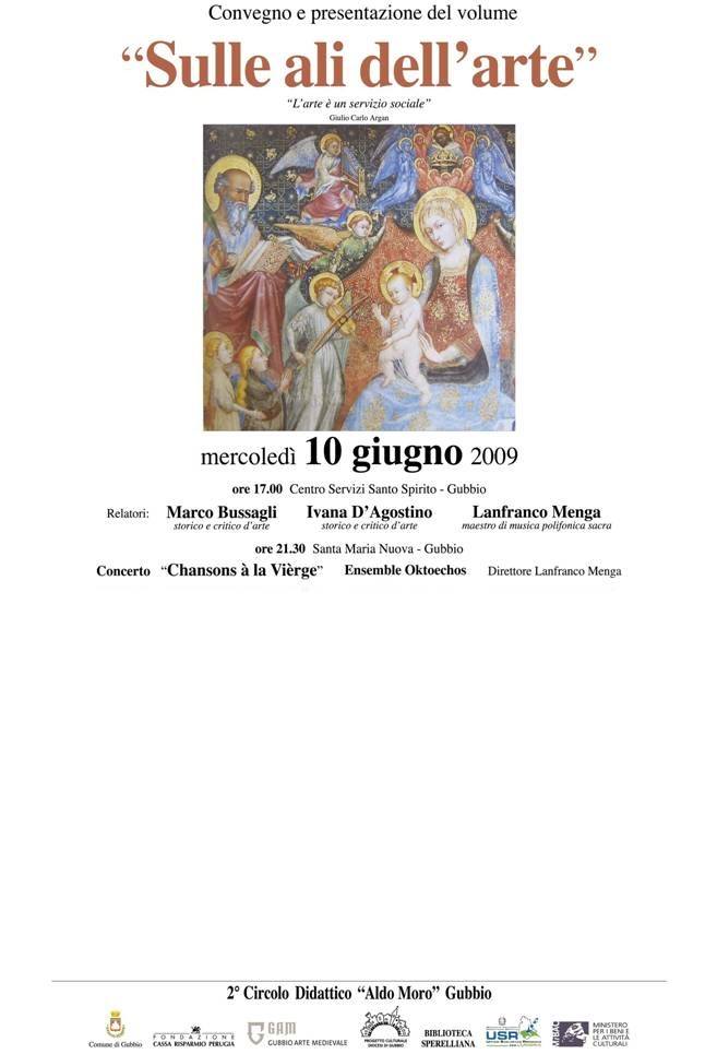 La presentazione del libro Sulle ali dell’arte, compendio del lavoro dei bambini sul Patrimonio artistico eugubino sarà presentato al centro Servizi Santo Spirito di Gubbio dagli storici dell’arte Marco Bussagli e Ivana D’Agostino con due mirati interventi, mentre il Maestro Lanfranco Menga, esperto di canto prepolifonico introdurrà La musica degli angeli.