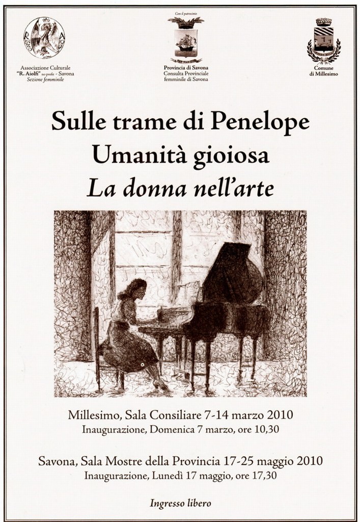 L’Associazione “R. Aiolfi” di Savona con la sua Sezione Femminile di cui è responsabile la Dr.ssa Sonia Pedalino, ha voluto parlare della creatività femminile, organizzando una mostra riservata alle Artiste al fine di prospettare una riflessione sulla notorietà storica e contemporanea delle donne nell’arte, indagando le tecniche usate ed il contenuto non solo estetico dei loro lavori.