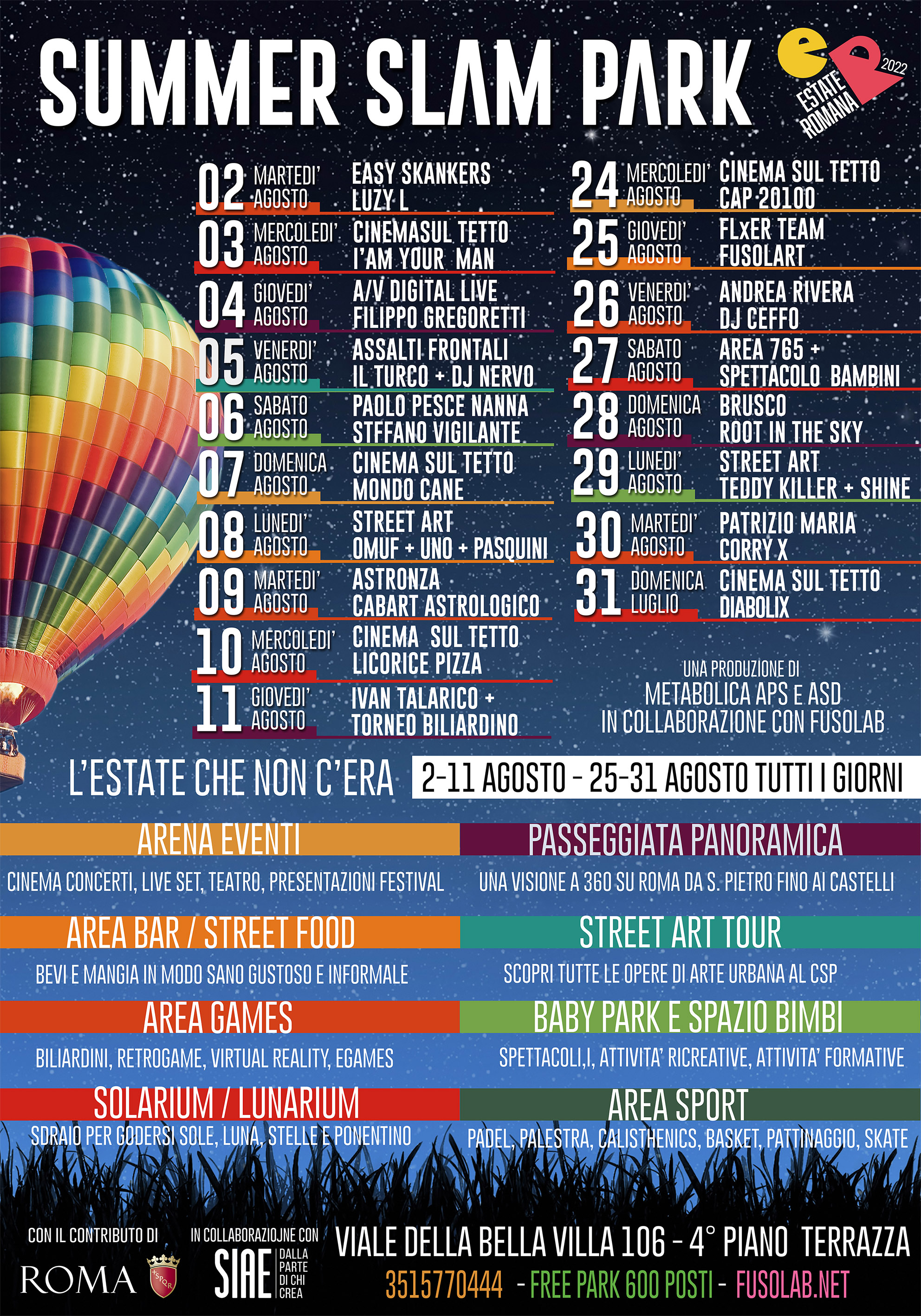 Summer Slam Park è una manifestazione a ingresso gratuito di diciassette giorni dove musica, cinema, teatro, a/v digital performance e street art vengono coniugati affrontando sia proposte più tradizionali e popolari che generi differenti e nuovi stimoli ambientali, sonori e digitali con l’aspirazione di aggregare la cittadinanza in un’esperienza condivisa. La cifra distintiva risiede inoltre nelle tantissime attività collaterali, molte delle quali dedicate ai minori, sia per quanto riguarda l’intrattenimento che lo sport e la formazione. Il cartellone suddiviso in due tranche - la prima dal 2 all’11 e la seconda dal 25 al 31 agosto - propone un’arena cinema con prime visioni uscite in sala negli ultimi due anni; un palco concerti con protagonisti indiscussi della scena romana e nazionale (Assalti Frontali, Brusco, Area 765, Patrizio Maria, Easy Skankers); serate di teatro-canzone con punte di diamante come Ivan Talarico e Andrea Rivera e stand-up cabaret con Stefano Vigilante, Paolo Pesce Nanna e Astronza; due date di perfomance A/V di arte digitale con i collettivi FLxER e Fusolart; interventi di live painting a cura di a.DNA Collective che grazie agli interventi di street art degli artisti Omuf e Teddy Killer trasformano questo spazio in una tela a cielo aperto. Tutti gli eventi sono a ingresso libero senza necessità di prenotazione.