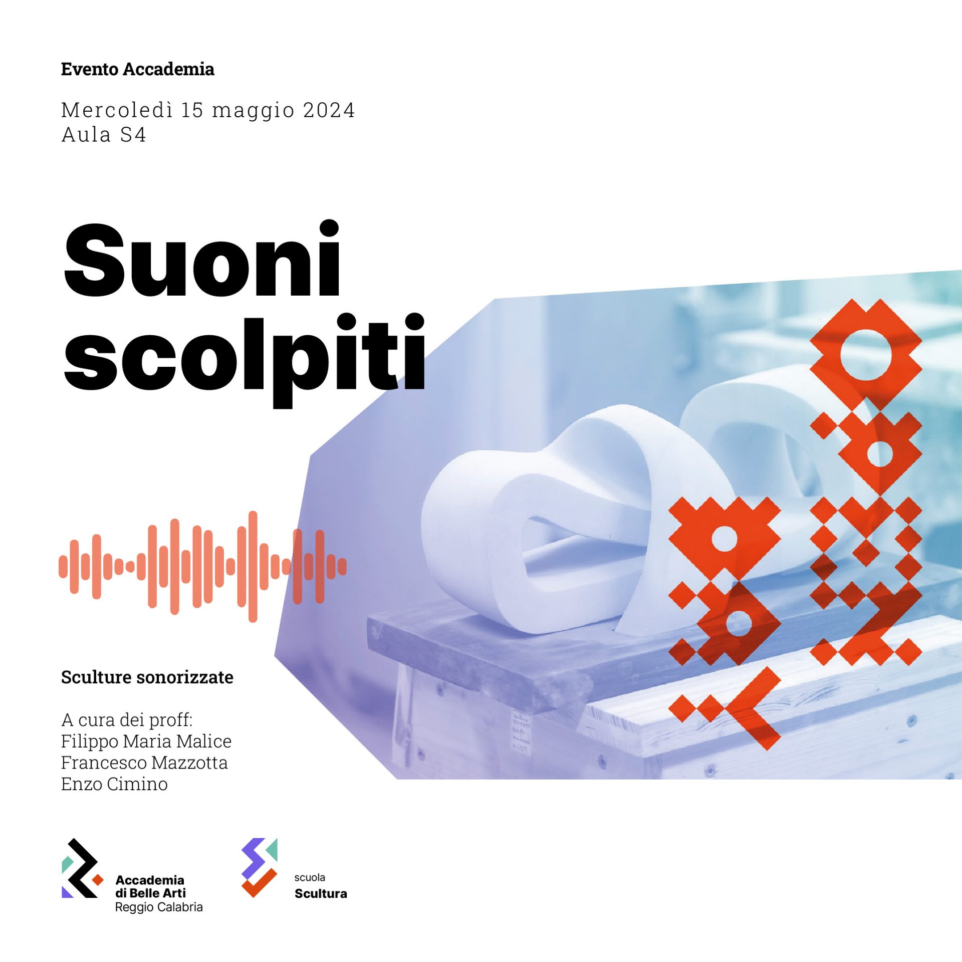 Suoni scolpiti è un esperienza sensoriale che coinvolge lo spettatore e lo immerge in un atmosfera dove la scultura, i suoni, le luci e i colori si fondono insieme trasmettendo emozioni uniche. L’installazione costituita da varie sculture, elementi, forme o oggetti realizzati con materiali diversi, saranno disposti all’interno dello spazio laboratoriale dell’aula S4 è verranno contaminati dal suono preregistrato e sintetizzato, dalle luci e dai colori che combineranno variazioni cromatiche in maniera simultanea consentendo di creare suggestive atmosfere.