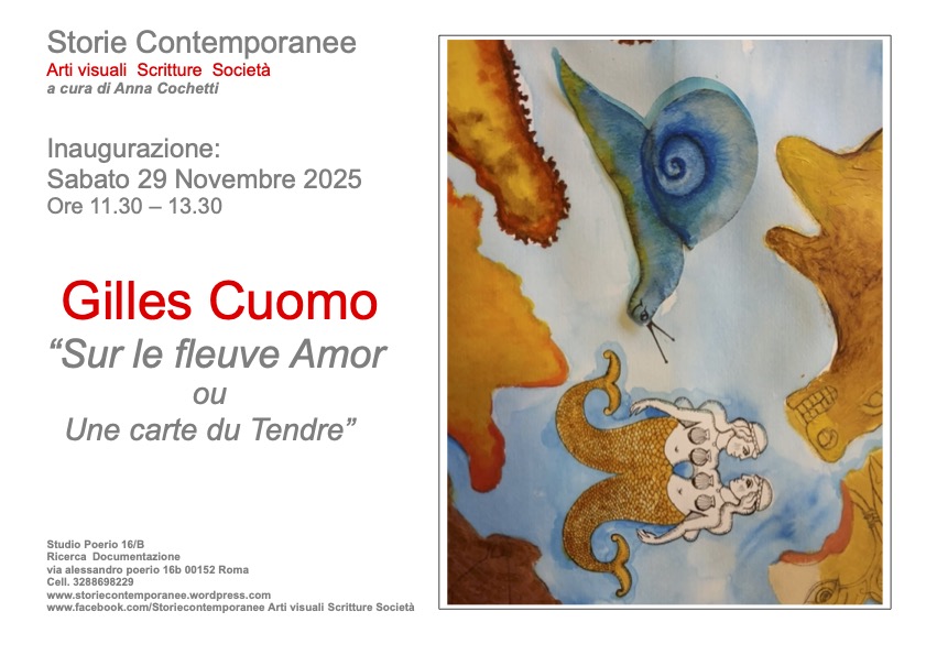 Sabato 29 Novembre 2025, alle ore 11.30 il Progetto STORIECONTEMPORANEE, a cura di Anna Cochetti, nello spazio Studio Ricerca e Documentazione di Via Poerio 16/B ospita “Sur le fleuve Amor… ou… Une carte du Tendre”, installazione parietale di un grande Libro d’artista, in copia unica, che costituisce il corpus della nuova personale di Gilles Cuomo, come mise en place di un percorso di ricerca costruito per lo spazio romano, a due anni di distanza dal precedente intervento.