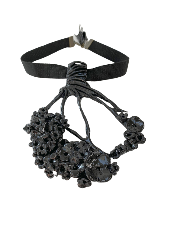 Tra le altre opere in mostra, ci sono “Abito Qui #2”, una installazione realizzata in carta kraft e carta velina che rappresenta un abito di dimensioni reali, e “Jewels”, una serie di sculture-gioiello, anche indossabili, realizzate nel 2020 in paper-clay, resina e pigmenti.