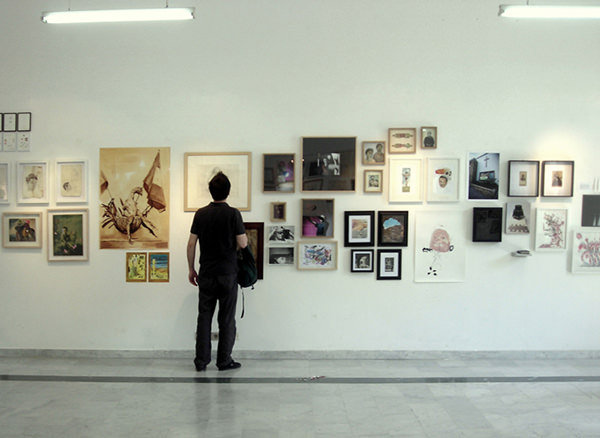 Ogni coppia di artisti ha realizzato due opere su carta, accolte all’interno delle decorazioni circolari di un antico portone in legno situato tra le fronde di due grandi alberi.