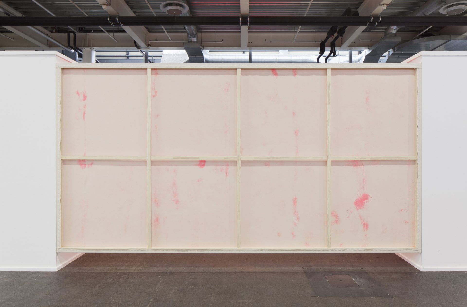 L’artista ha distribuito nello spazio tre volumi colorati delle esatte dimensioni dell’unica porta a vista. Questi volumi sono tele tese su telai complessi e tutta l’installazione cambia cromaticamente lo spazio. La percezione delle dimensioni è cambiata.