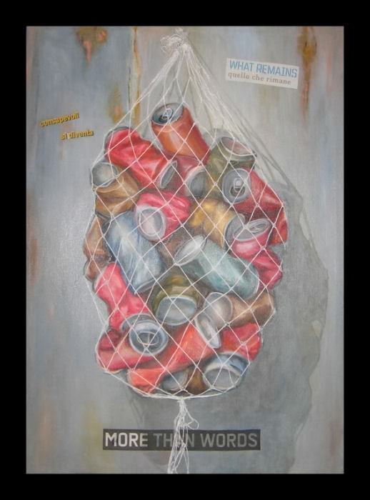 In questa mostra piacentina, di forte impatto scenografico, l’artista presenta dunque immagini crude, ma di grande realismo, dalle quali è possibile cogliere tutto il degrado ambientale dei nostri giorni: fusti di materiali fortemente inquinanti, arrugginiti e consunti, abbandonati a loro stessi; lattine di birra e bottiglie dimenticate dopo l’uso; oli che fuoriescono dai vetusti contenitori invadendo il territorio circostante.