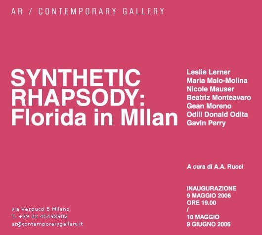 Rapsodia sintetica non vuole essere una mostra completa in senso lato, quanto piuttosto una rete turbinante gettata da un capo all’altro del paesaggio sub-tropicale della più fervida regione d’arte contemporanea. L’artista A.A. Rucci, ormai un veterano della AR Contemporary, qui curatore della mostra, ha selezionato 7 artisti contemporanei della famosa penisola, in grado di ampliare i confini della pittura e della percezione del pubblico sull’arte della Florida. A prescindere dalle analogie stilistiche o tematiche, e persino da qualunque gusto regionale, Rucci ha messo insieme Leslie Lerner (Sarasota), Maria Malo-Molina (Daytona Beach, Nicole Mauser (Sarasota), Beatriz Monteavaro (Miami Beach), Gean Moreno(Miami), Odili Donald Odita (Tallahassee) and Gavin Perry (Miami Beach).