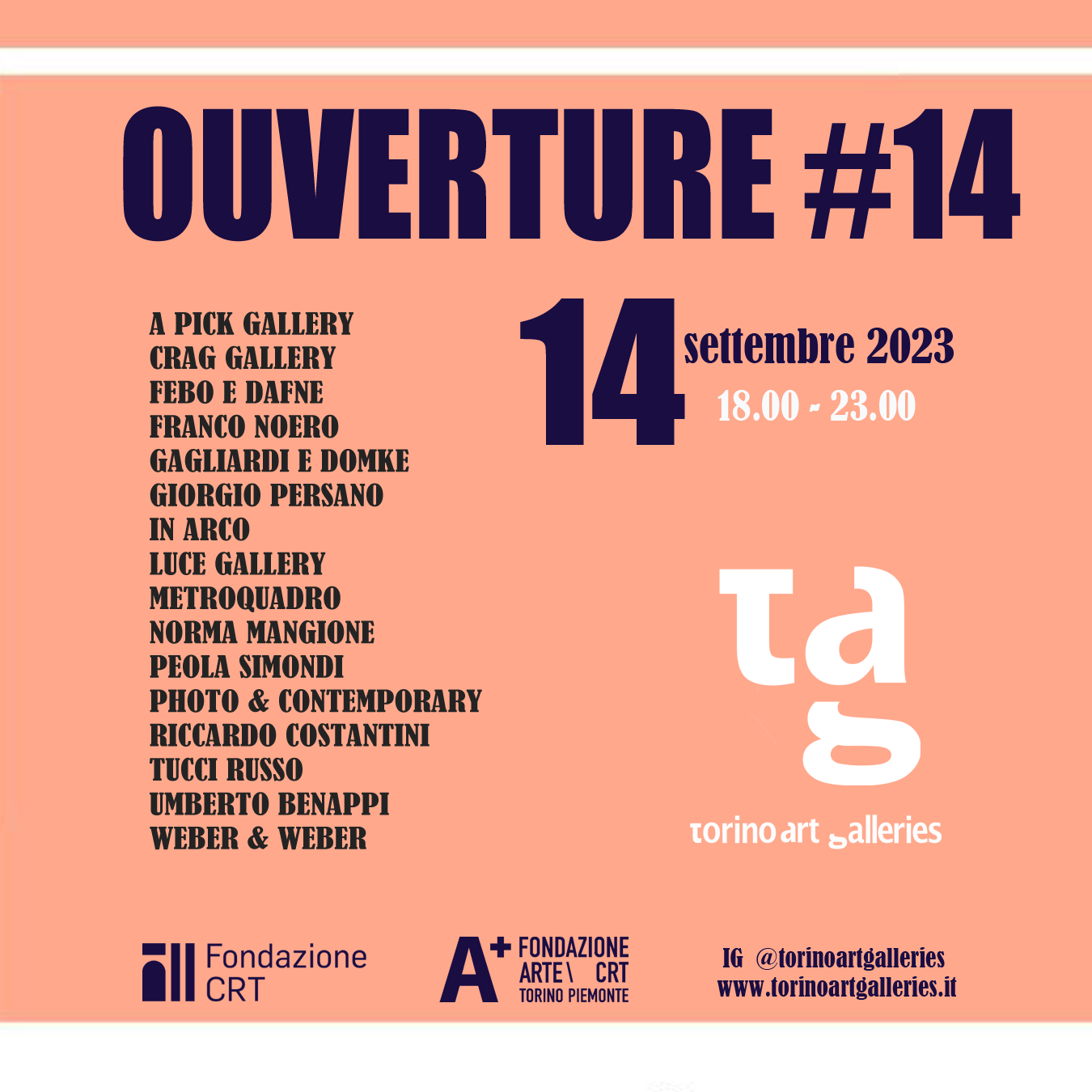 L’Associazione TAG - Torino Art Galleries è lieta di annunciare la nuova edizione di TAG OUVERTURE #14 che si terrà presso le gallerie associate di Torino giovedì 14 Settembre 2023 dalle ore 18 alle ore 23.