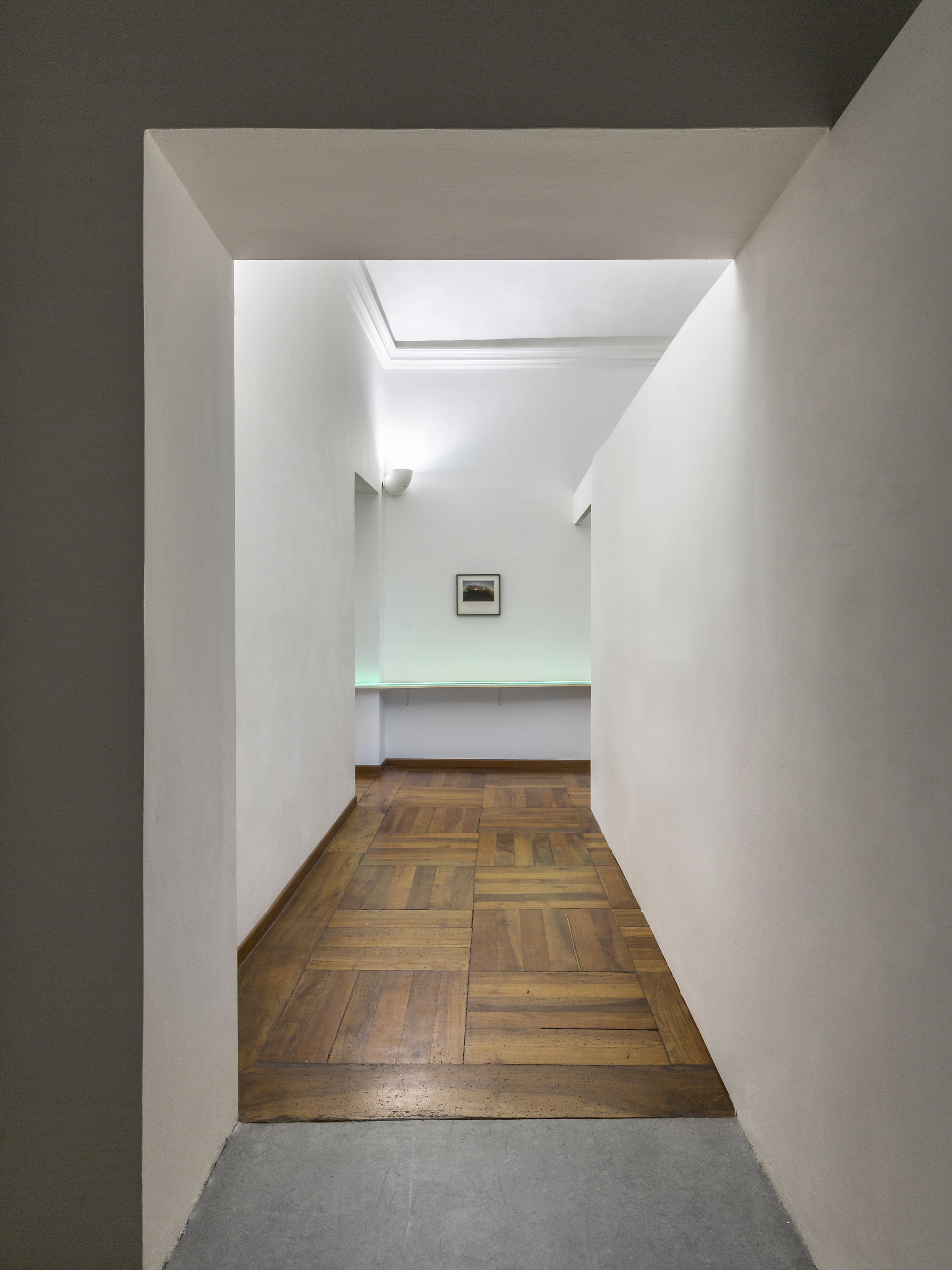 L’allestimento, ideato da Laura Pugno, si apre con una fotografia, un portale d’accesso. Si tratta di un paesaggio al tramonto che racchiude una duplice anima: metafora della fine, ma anche di inizio di una nuova era. Abendland (2023) (1), titolo dell’opera di Pugno, “terra del tramonto”, raffigura una roccia immersa nell’ombra che emerge e si staglia contro il calar del sole, un’enorme creatura che solleva con forza il bosco e promette salvezza.