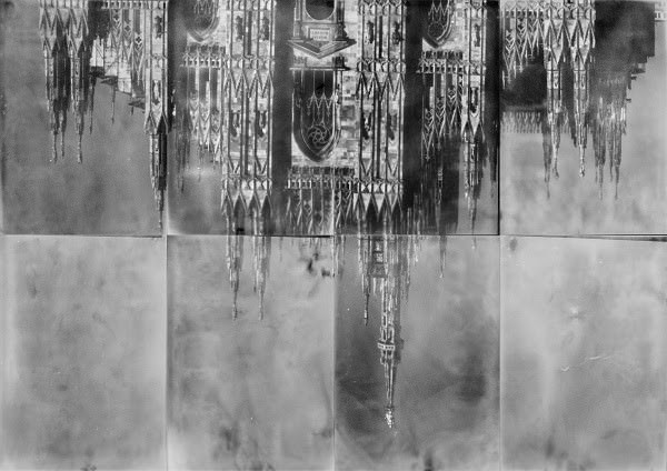 La città è protagonista della serie che dà il titolo alla mostra, realizzata da Homma appositamente per questa occasione. Si tratta di fotografie di frammenti di Milano in cui sono riconoscibili alcune delle architetture più iconiche: il Duomo, la Torre Branca, la Torre al Parco di Vico Magistretti, oltre ai più recenti grattacieli che hanno popolato l’orizzonte urbano negli ultimi anni, opera di Zaha Hadid e Arata Isozaki. Homma riprende queste fotografie con una camera oscura, rifacendosi non soltanto alla storia del mezzo che utilizza e della rappresentazione prospettica in generale (molti pittori, da Leonardo a Canaletto, da Caravaggio a Vermeer, hanno dipinto aiutandosi in questo modo), ma risalendo ancora più indietro: è la città che, come Narciso, si specchia nell’acqua, ritrovandosi sottosopra e offrendosi di conseguenza alla propria riscoperta. La metropoli improvvisamente rallenta nelle fotografie di Homma, il brulichio delle strade è sostituito dalla lentezza del rituale: finalmente si può esplorare ogni dettaglio.