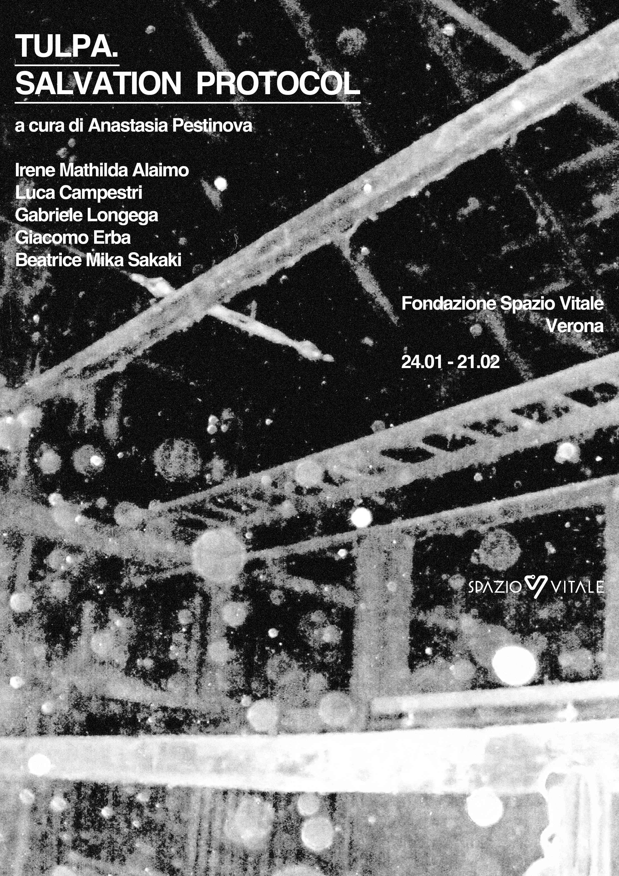 TULPA. SALVATION PROTOCOL a cura di Anastasia Pestinova, in programma presso Fondazione Spazio Vitale dal 24 gennaio al 21 febbraio 2026, riunisce i lavori di Irene Mathilda Alaimo (2000), Luca Campestri (1999), Giacomo Erba (2001), Gabriele Longega (1986) e Beatrice Mika Sakaki (1999) all'interno di un progetto espositivo dedicato al medium come dispositivo tecno-religioso in stretta connessione con la sorveglianza.