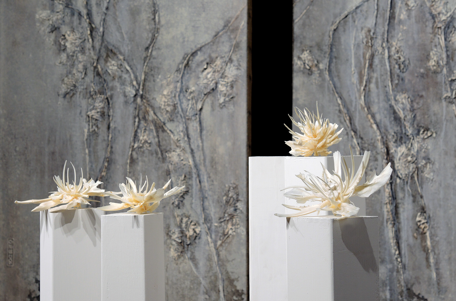 La Galleria Kalpa Art Living presenta a Volterra le artiste Tamara Ferioli e Olga Niescier, in dialogo in una elegante installazione di molteplici sculture organiche di fiori e di tele verticali, formando un giardino simbolico, in delicato contrasto con le antiche mura storiche di Palazzo dei Priori