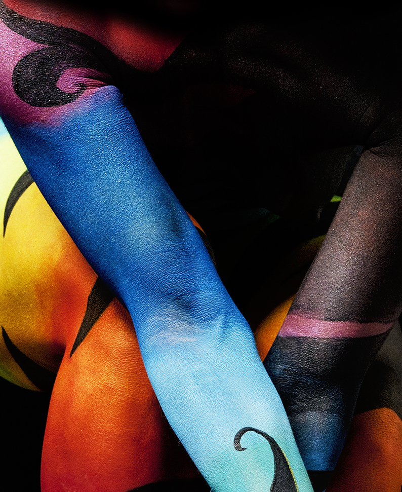 Le opere sono frutto della costruzione di un lungo e meticoloso lavoro plurilinguistico in cui, all’interno della composizione visiva, si combinano la passione per la fotografia e l’arte del body painting e una ardita sperimentazione pittorica ricca di interessanti passaggi cromatici.