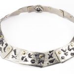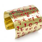 La rielaborazione di modelli di scrittura remoti, ancora da codificare - e per questo percepibili nella loro essenza asemica - dettano al disegno una serie di dinamiche sempre nuove, possibilità d’immagine infinite e sempre suscettibili di variazione. Nel gioiello questo si sviluppa in emersione materica rispetto alla scrittura propria dell’artista, un corsivo serrato, rigoroso, inciso in lastre e poi eternamente impresso nel metallo con la tecnica della fusione a cera persa: il concavo dello smalto riccamente disposto e il convesso dell’incisione si rincorrono su nastri scorrevoli per letture mai univoche né unidirezionali.