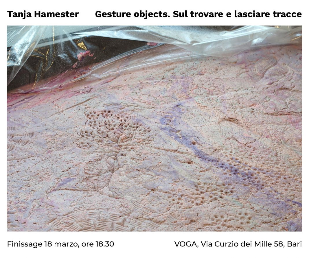 Tanja Hamester si inserisce nel solco di questa distinzione per costruire una archeologia personale dei luoghi che incontra. Sin dal suo arrivo a Bari lo scorso agosto, infatti, l’artista ha portato avanti un’indagine dello spazio cittadino usando una pratica su cui lavora da anni, un insieme di tattiche volte a non cadere nella rappresentazione stereotipata di un luogo. Ad approcci che riducono un posto ai suoi “luoghi comuni” – attraverso riferimenti a monumenti, edifici, figure, ed eventi del passato – Tanja Hamester oppone una strategia dal basso che si basa su incontri, percorsi e storie. I gesture objects sono gli elementi fondamentali di questa strategia artistica. Ispirati dall'indagine di un territorio, questi oggetti costituiscono un archivio personale, che testimonia il passaggio implicato di un corpo in movimento, quello dell’artista.
