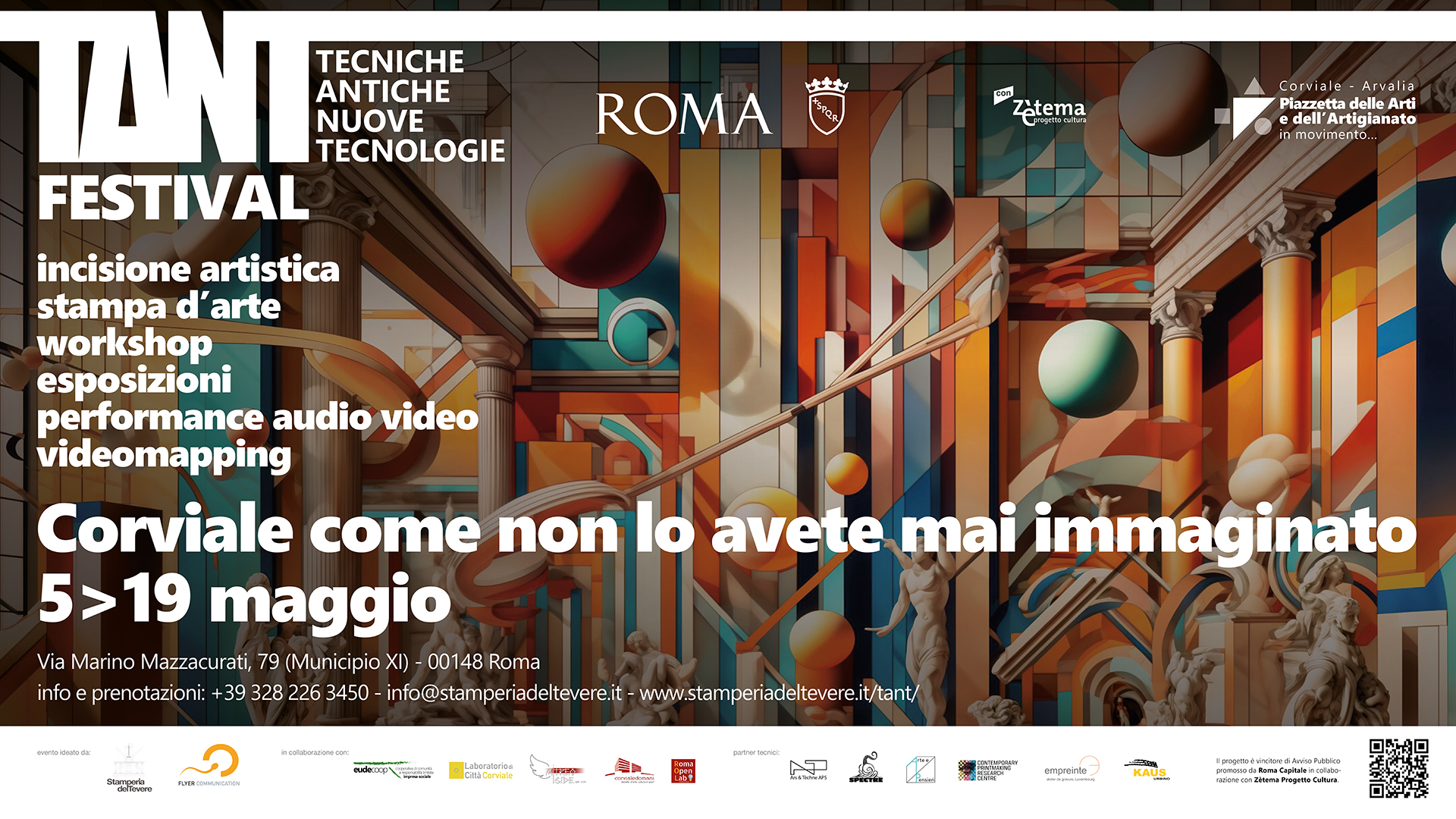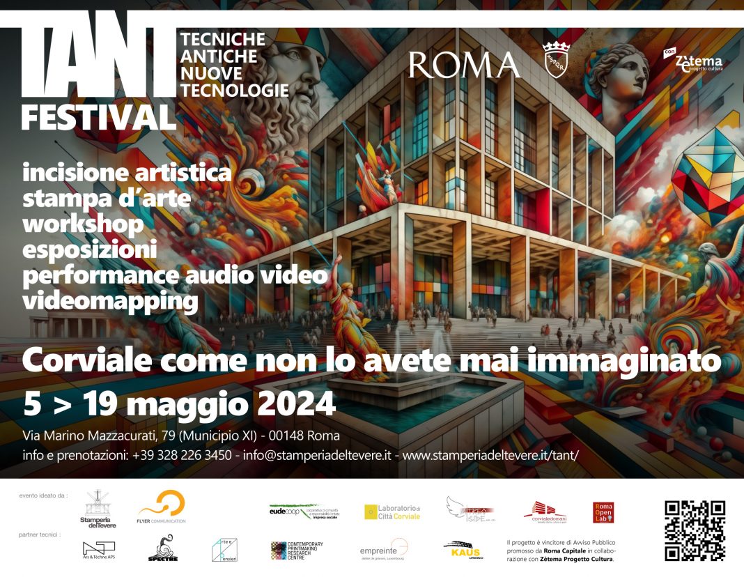 Si apre domenica 5 maggio 2024 in Via Marino Mazzacurati, 79 a Roma, la prima edizione 2024 del TANT Festival – Tecniche Antiche e Nuove Tecnologie, progetto che punta a valorizzare l’arte e la creatività attraverso la sperimentazione artistica e l’interdisciplinarietà di azioni e linguaggi.