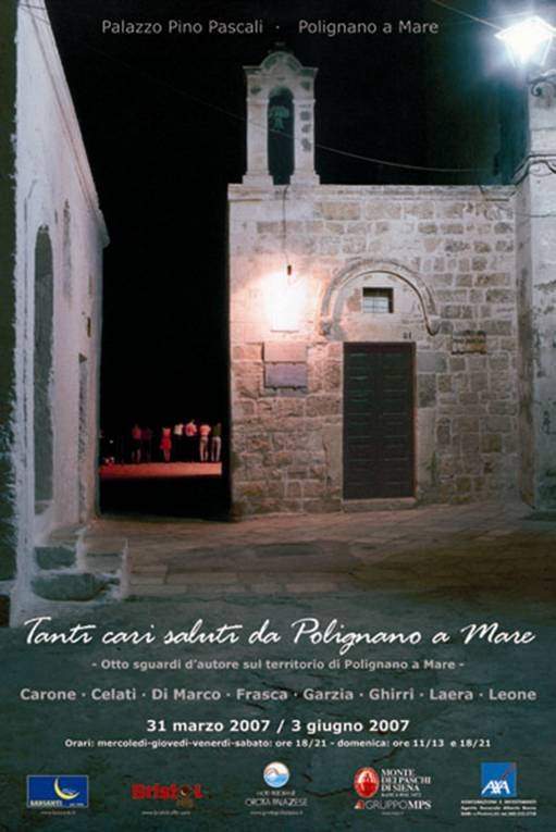 Il ciclo di fotografie di Miki Carone s’intitola ‘Apparizioni’: l’artista avvezzo al gioco ironico e concettuale propone una serie di ibridazioni tra il reale e il fantastico proponendo per esempio, l’immagine dell’Abbazia di San Vito abitata dal Santo stesso in persona o che funge da sfondo all’immancabile bacio tra innamorati come vuole una certa immagine ‘cartolinesca’ e kitsch del luogo. Frasca (Francesco Scagliusi) si è formato a Polignano assorbendone i colori, le luci, gli sguardi, e sono proprio questi i protagonisti delle sue fotografie: da quello intenso del pescatore a quello di una ragazza che riflette nei suoi occhi l’immagine dell’Abbazia di San Vito. Le foto di Gianni Leone coprono l’arco di un decennio, sono paesaggi notturni e misteriosi che riservano sorprese a chi ama addentrarsi tra significati nascosti dove il silenzio e la memoria sono protagonisti, come l’attesa di un evento che sta per giungere. Una poetica metafisica si legge nelle foto di Stefano Di Marco che ama soffermarsi sui dettagli, mettere a fuoco luoghi sospesi in un tempo indefinito come solo i posti di mare sanno restituire. Ancora il mare come presenza dominante nelle foto di Cosmo Laera, l’uso del bianco/nero serve a concentrare l’attenzione sulle infinite modulazioni e gradazioni di luce che il fotografo riesce a disciplinare in modo del tutto personale. Berardo Celati guida lo spettatore in un tour nel centro storico di Polignano sotto un cielo di nuvole dalle infinite tonalità che diviene il ‘peso visivo’ della sequenza fotografica, il bianco/nero serve inoltre ad accentuare le forti geometrie tipiche dei nostri paesi del Sud. Luoghi balneari e turistici si trasformano in set cinematografici nelle immagini di Carlo Garzia: la grotta Rondinelle frequentata da un gruppo di persone che ci fa pensare a un film di Luis Bunuel, oppure un trullo a Portalga con un muretto a secco la cui texture ruvida e grezza fa da contrasto con la targa della strada dove si legge “Via Federico Fellini” e l’effetto diviene subito felliniano, appunto, straniante ed ironico allo stesso tempo.