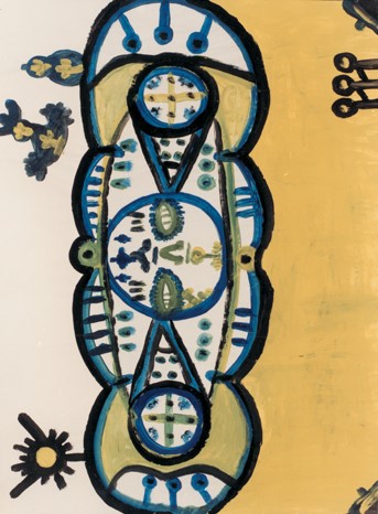 La mostra si compone di una ventina di opere tempera su carta, hanno dimensioni simili (100 x 75circa) e due arazzi. Un linguaggio grafico che esprime l’articolato mondo mentale di uno degli artisti più potenti e meno conosciuti nel panorama dell’arte irregolare italiana.