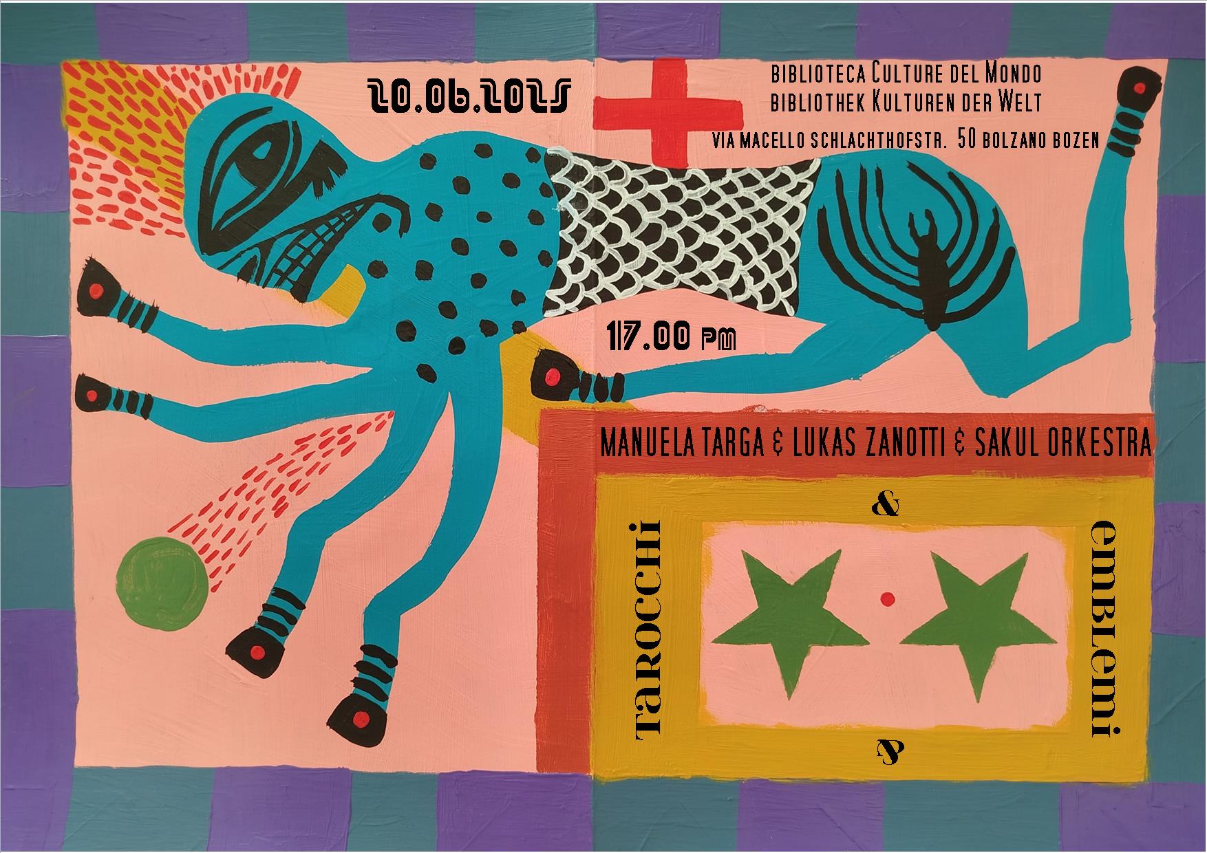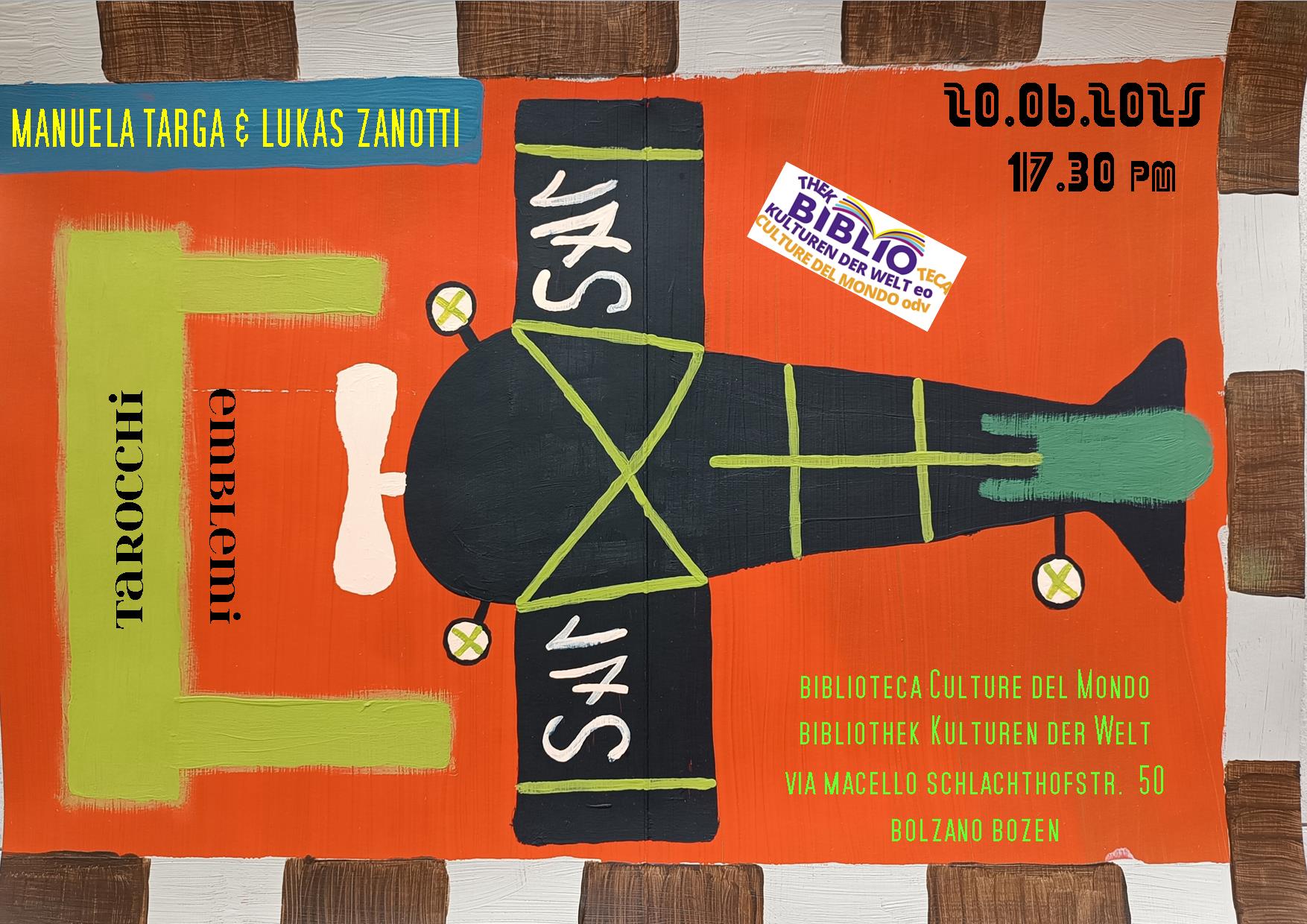 Tarocchi & Emblemi - Manuela Targa e Lukas Zanotti - 20.06.2025 ore 17.30 - Biblioteca culture del mondo - via Macello 50 Bolzano - I Tarocchi sono innervati da Emblemi, così come gli Emblemi respirano con i polmoni dei Tarocchi. Qui si incontrano, tra fughe incursioni e dribbling, la squadra femminile dei Tarocchi marsigliesi, in particolare la Giustizia, la Forza e la Stella, messe in campo dalla funambolica maga Manuela Targa, con il corteo colorato di buffonesco e nobiltà degli Emblemi stendardi, allenati e disposti dall'alchimista Lukas Zanotti.