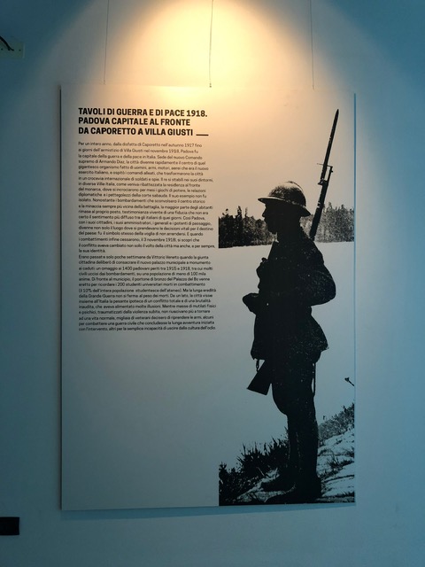 L’esposizione ripropone l’ultimo anno di guerra e lo fa da dietro le quinte, conducendo il visitatore dentro le stanze del comando. Per un’intero anno Padova fu la capitale della guerra e della pace in Italia e l’esposizione è un racconto di questo attraverso oggetti evocativi e momenti di vita.