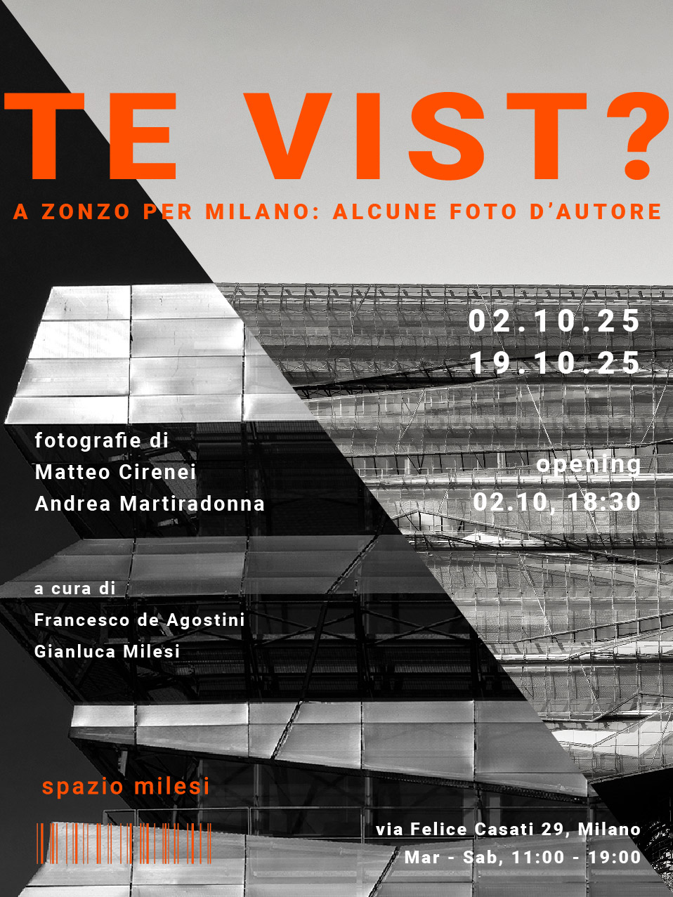 Spazio Milesi ospita “TE VIST”, una mostra che ci invita a guardare Milano con occhi nuovi. Matteo Cirenei e Andrea Martiradonna raccontano, in bianco e nero, l’anima nascosta di architetture recenti, tra dettagli sospesi e visioni intime, con stampe che riflettono il loro sguardo unico.