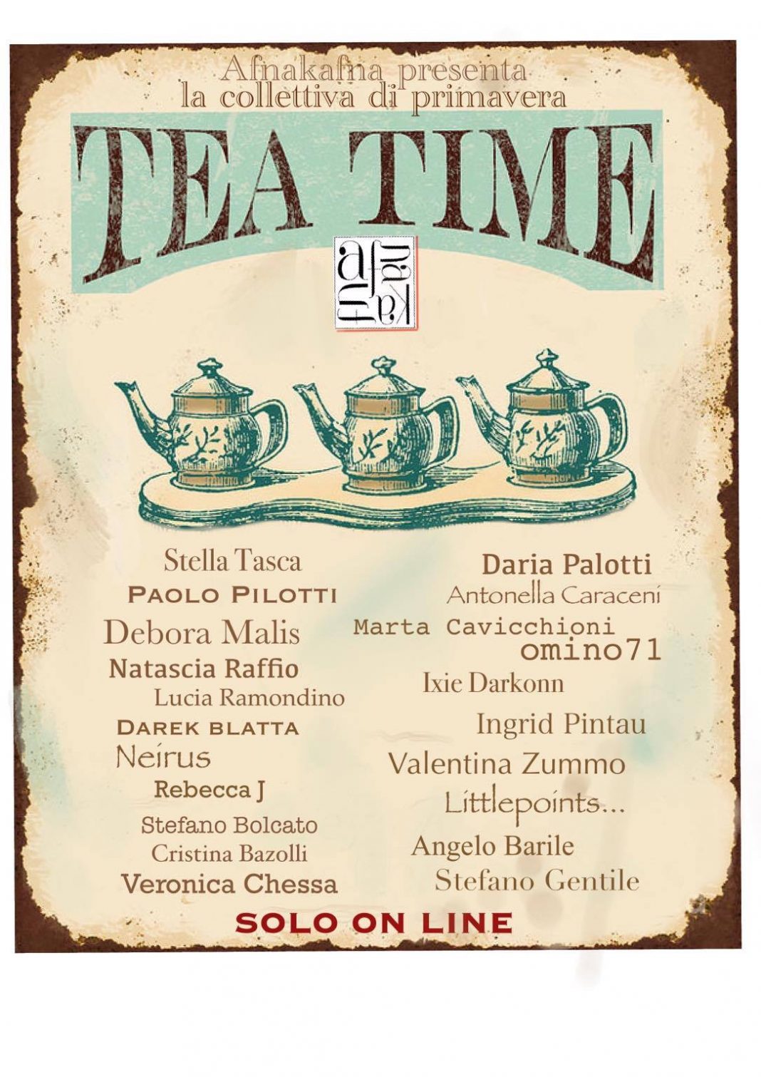 La mostra, come noto, non si potrà svolgere in galleria per le norme di distanziamento sociale relative al Covid19 ma verrà inaugurata on-line sul portale https://exhibbit.com/. Le opere saranno pubblicate e disponibili alla vendita sulla pagina https://www.artsy.net/show/afnakafna-tea-time sul portale ARTSY.