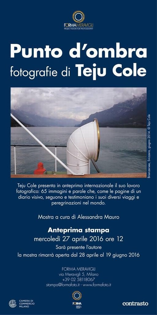 Cole, istantanee su cui di volta in volta l’autore stesso costruisce una riflessione, un ricordo o anche una piccola storia. Punto d’ombra è un lavoro originale e coraggioso che combina la poetica fotografica di paesaggio con la prosa, lirica, allusiva e impegnata di Teju Cole. Un progetto che viene presentato in anteprima internazionale a Forma Meravigli, accompagnato dal libro Punto d'ombra, pubblicato da Contrasto per la collana In parole. “Una strada non è solo la superficie asfaltata, i palazzi ai lati, le macchine veloci o lente, la gente intorno a te. È anche il modo in cui tutte quelle cose sono in relazione, come si compongono e ricompongono. Appena alcuni elementi si allontanano dal campo visivo, altri diventano visibili: tu ti muovi, le macchine si muovono, altre persone si muovono, persino il sole si sta muovendo lentamente, e in mezzo a tutto questo movimento multidimensionale devi decidere quando premere l'otturatore, decidere quale di questi istanti mutevoli è più interessante degli altri. Un secondo prima, non è ancora successo. Un secondo dopo, se ne è andato per sempre, irrecuperabile.”Teju Cole Teju Cole è l’autore di Città Apertae Ogni giorno è per il ladro ed è il critico fotografico per The New York Times Magazine. Per il suo lavoro letterario ha vinto, tra le altre cose, il premio PEN/Hemingway Prize, il Windham Campbell, l'Internationaler Literaturpreis. Nato negli USA da genitori nigeriani, Teju Cole ha passato la sua infanzia in Nigeria per tornare negli Stati Uniti a 17 anni, dove tuttora vive, a New York. Punto d’ombra Dal 27 aprile al 19 giugno 2016Mercoledì, venerdì, sabato e domenica 11.00 –20.00Giovedì 12.00 –23.00Lunedì, martedì chiuso Ingresso intero: 8 euro Ridotto: 6 euro #puntodombra Forma Meravigli Via Meravigli 5 20123 Milano 0258118067 www.formafoto.itTwitter @formafoto Facebook/FondazioneFormaPerLaFotografia Ufficio Stampa Forma-Contrasto Valentina Notarberardino stampa@formafoto.itvnotarberardino@contrasto.it 3666678862 Ufficio Stampa Camera di Commercio Emanuela Croci ufficio.stampa@mi.camcom.it