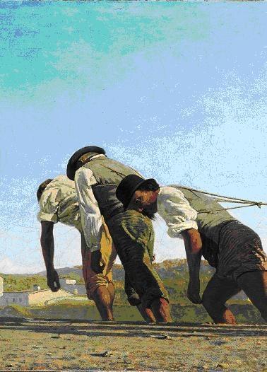 Di questa "attenzione al sociale", per dirla con un linguaggio d'oggi, è emblema lo splendido, fortissimo olio scelto come "logo" della mostra. E' la celeberrima "Alzaia" del 1864, dove tre giovani maschi sono raffigurati nello sforzo bruto di trascinare controcorrente, piegati dalla fatica, un naviglio che nel quadro non compare ma di cui si intuisce la resistenza oltre che l'esistenza.
