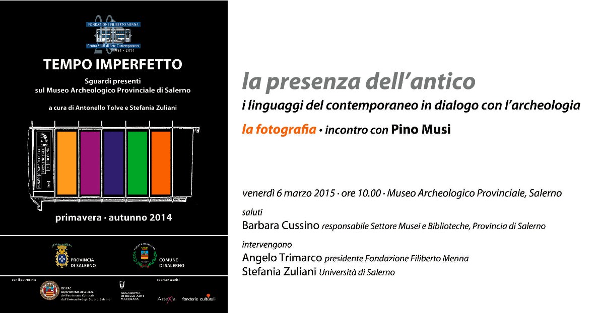 Nell’ambito del progetto, patrocinato dal DISPAC dell’Università di Salerno e dall’Accademia di Belle Arti di Macerata, venerdì 6 marzo alle ore 10 verrà proposta un riflessione sulla complessa relazione che lega i linguaggi del contemporaneo all’archeologia, mettendo così in luce come la presenza dell’antico sia diversamente attiva nei discorsi e nelle pratiche dell’arte presente. In particolare, al centro dell’incontro sarà l’esperienza di Pino Musi, fotografo da sempre impegnato in una raffinata e rigorosa ricerca visiva sull’architettura del presente e del passato, autore per FMR di una serie di immagini dedicate all’Italia delle origini esposta nel 2012 al Museo dell’Ara Pacis.