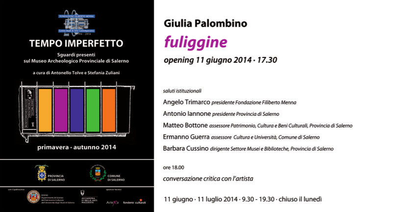 La Fondazione Filiberto Menna – Centro Studi d'Arte Contemporanea, in collaborazione con la Provincia di Salerno e con il Comune di Salerno, soci fondatori della Fondazione, è lieta di annunciare il progetto FULIGGINE di Giulia Palombino, seconda mostra del ciclo Tempo Imperfetto a cura di Antonello Tolve e Stefania Zuliani. L’esposizione, che verrà inaugurata negli spazi del Museo Archeologico Provinciale di Salerno (in via San Benedetto, 28) mercoledì 11 giugno alle ore 17.30, sarà visitabile dal 12 giugno all'11 luglio 2014 (tutti i giorni dalle 09.00 alle 19.30, lunedì escluso).