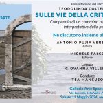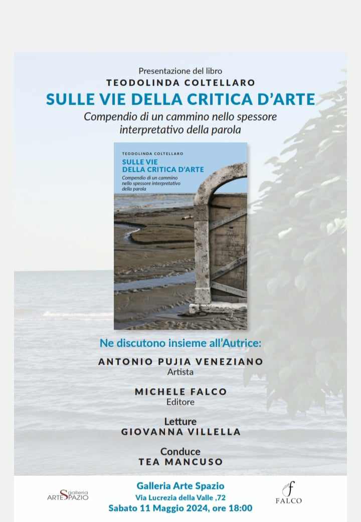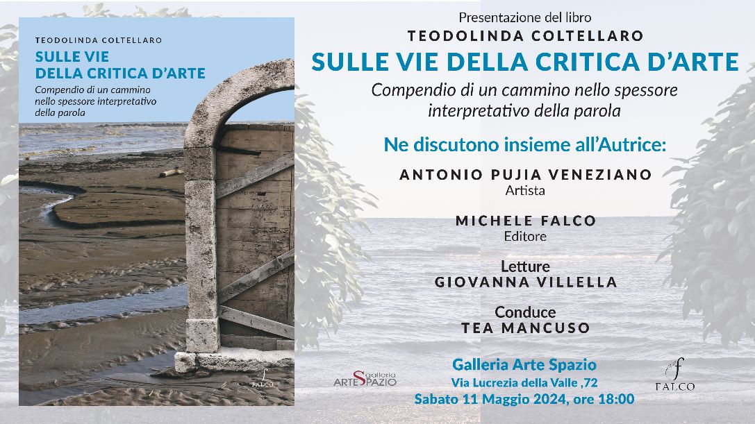 Sabato 11 maggio 2024, con inizio alle ore 18:00, negli spazi della Galleria Arte Spazio di Luigi Verrino a Catanzaro, si terrà la presentazione del libro del noto critico d’arte Teodolinda Coltellaro “ Sulle vie della critica d’arte- Compendio di un cammino nello spessore interpretativo della parola”, pubblicato per le edizioni Falco. L’Autrice discuterà del libro con l’artista Antonio Pujia Veneziano e l’editore Michele Falco, mentre Giovanna Villella proporrà alcune letture selezionate. Condurrà la serata Tea Mancuso.