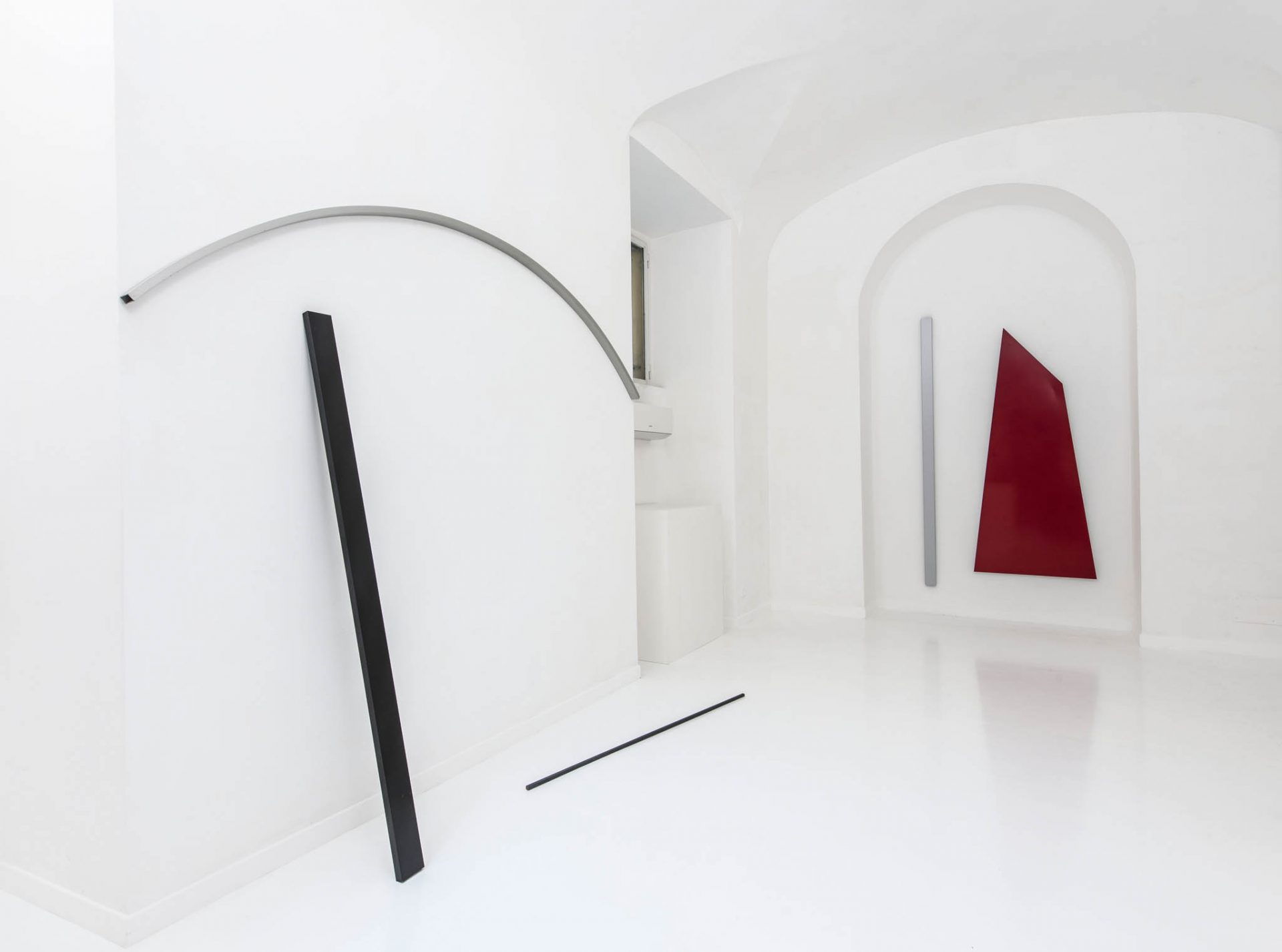 Le tre grandi sculture in mostra, nel reciproco rapportarsi tra loro, con chi le abita e con lo spazio stesso della galleria, finiscono col creare un’opera unica di grande suggestione. Si tratta di Dimorare nella scultura e Costruire-abitare i luoghi del 1981 e del più recente Immagine Spazio 2 del 2013, accompagnati dai disegni preparatori. I singoli elementi che compongono le opere (segmenti, poligoni, archi) sembrano estratti in questo caso dalla materia chiamata spazio, rivelazioni frammentarie della sua trama.