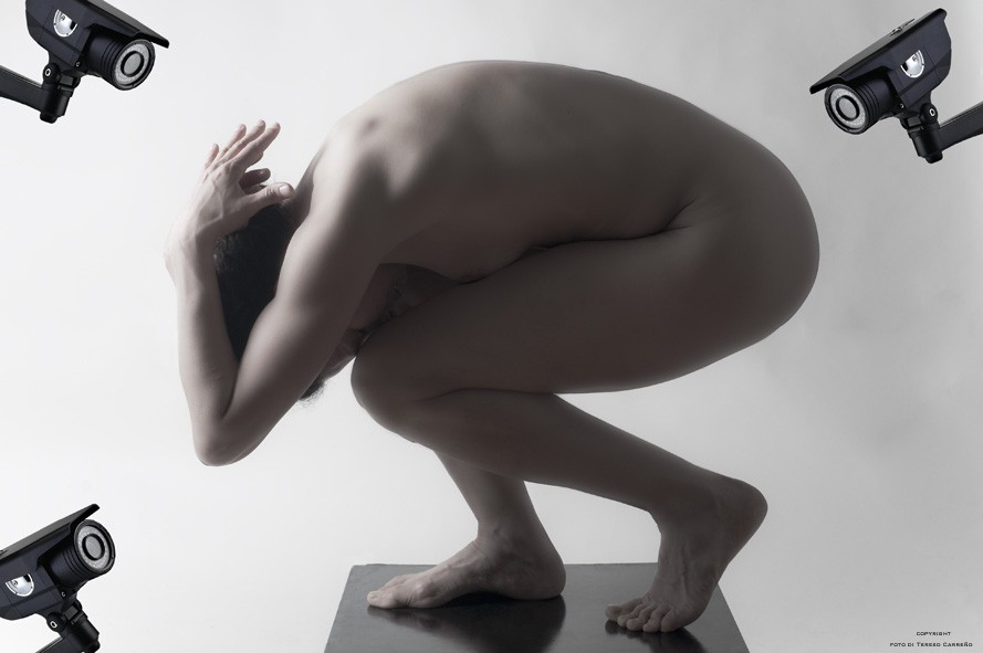 Nelle altre due sue ricerche presenti in mostra, “Riflessi” e “Mappa mondo”, l’autrice di nuovo si autoritrae, questa volta però per trasformare il suo corpo in un “corpo politico”, che rivela e assume su di sé le contraddizioni contemporanee. In “Mappa mondo” disegna le carte geografiche sulla sua stessa pelle, offrendoci una visione politico-sociale del mondo. Nella serie “Riflessi” troviamo invece immagini che riflettono un mondo dominato dall’ansia del consumo, dalla cultura dell’intrattenimento, da una violenza sempre più pervasiva. In una fotografia e in un’opera video, ad esempio, la vediamo sola, fragile e impotente, schiacciata da una pioggia di dollari, simbolo dello strapotere finanziario che, come un nemico invisibile, opprime i popoli nel mondo globalizzato. Volutamente teatrali, poetiche e stranianti, le immagini di Teresa Carreño rivendicano così la funzione sociale e politica del mezzo fotografico.