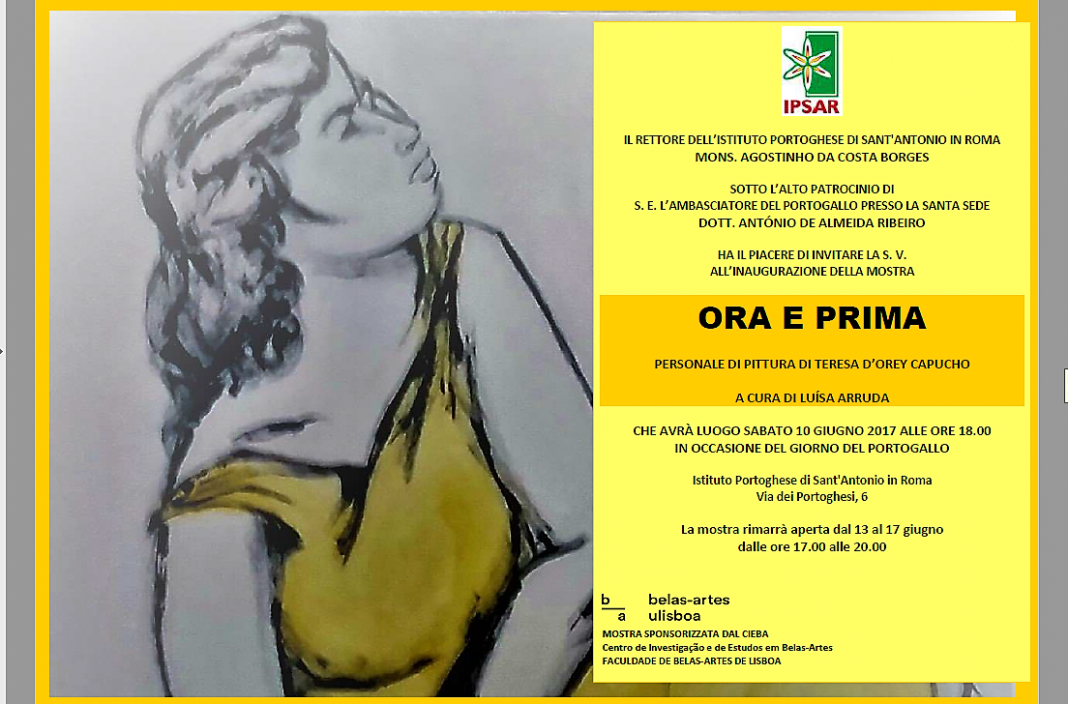 Il Rettore dell’istituto Portoghese Di Sant’Antonio In Roma, Mons. Agostinho da Costa Borges, sotto l’alto patrocinio di S. E. l’Ambasciatore del Portogallo presso la Santa Sede, Dott. António De Almeida Ribeiro, promuove la più recente mostra personale di pittura di Teresa d’Orey Capucho nella Galleria IPSAR, nella via dei Portoghesi, segnalando il 10 giugno, in cui si celebra il Giorno del Portogallo, di Camões e delle Comunità Portoghesi nel mondo.