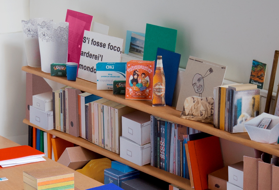 Per questo progetto, Teresa Giannico torna alla produzione di diorami meticolosamente assemblati, modelli tridimensionali in cartoncino su cui l’artista applica un collage di stampe riferite ad arredi e oggetti comuni. A tal fine, attinge a uno sterminato database di file grafici e fotografici accumulati per anni, sottratti alla loro funzione pubblicitaria (immagini da siti e riviste patinate di design e architettura) e divenuti oggetto di un’appropriazione ready-made. Un vero e proprio “riciclo di vecchie foto pubblicitarie, concepite in funzione di vetrina: mostrare la moda e il design di prodotti studiati per il mercato e, magari, già desueti a poche ore/giorni/mesi da una pubblicazione. Ed è questo il momento esatto in cui le verità che non intrattengono più, diventano bugie” (RL).