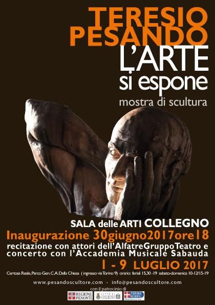 Le sculture di Teresio Pesando sono il risultato del desiderio di formare e plasmare la materia. I corpi umani sono l’ispirazione per le sue opere, esse sono il risultato di continue ricerche per posizioni ed espressioni del corpo. La scultura figurativa è sicuramente un genere d’arte tra le più difficili da eseguire, caratterizzata da complesse forme muscolari, che sono per Teresio un cimento, una sfida continua in ogni sua nuova opera. L’espressione della sua arte è realizzazione di un’idea. Il materiale che usa è il legno, creta cotta, gesso e bronzo. L’arte di Teresio si espone, si apre, si spoglia e si scopre nell’intimo delle sue opere. Teresio si esprime con il suo senso dell’amore per la vita e per l’arte, l’amore per il colore…” quel colore che tanto mi manca”. La mostra “L’Arte si espone” vuole rendere partecipi tutti i visitatori alla sua idea di arte, sensibilizzarli al suo messaggio artistico, affinché il ricordo della visita porti con sé una bellezza da condividere nella vita di tutti i giorni. L’artista ha voluto condividere l’inaugurazione della sua mostra con ad altri artisti: attori e musicisti.