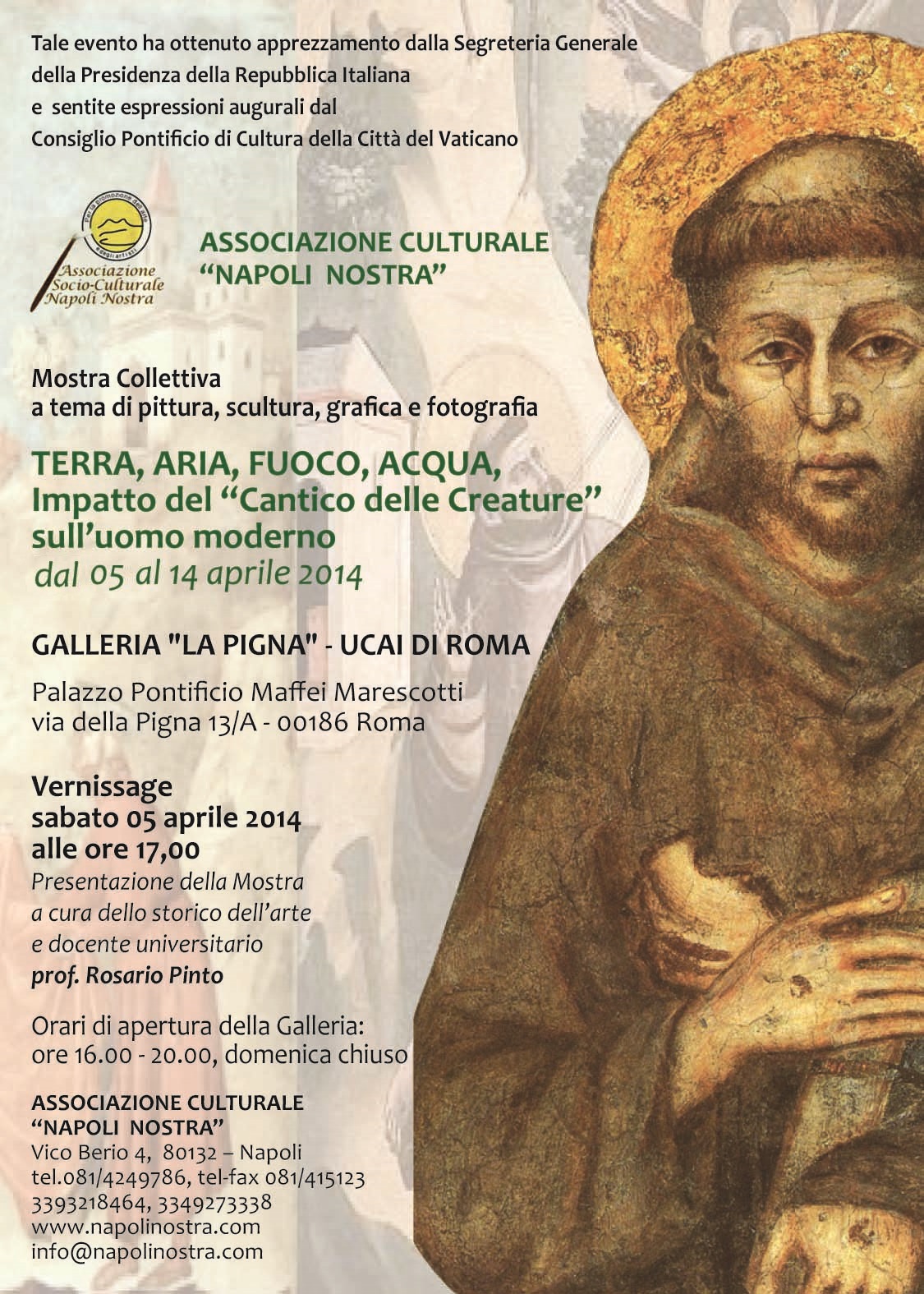 Le motivazioni di questa mostra a tema sono dovuti al fatto che gli ultra secolari principi enunciati nel “Cantico delle Creature” sono un riferimento di grande attualità per la salvezza del nostro pianeta, che in seguito all’inquinamento crescente causato dall’uomo corre rischi di distruzione.