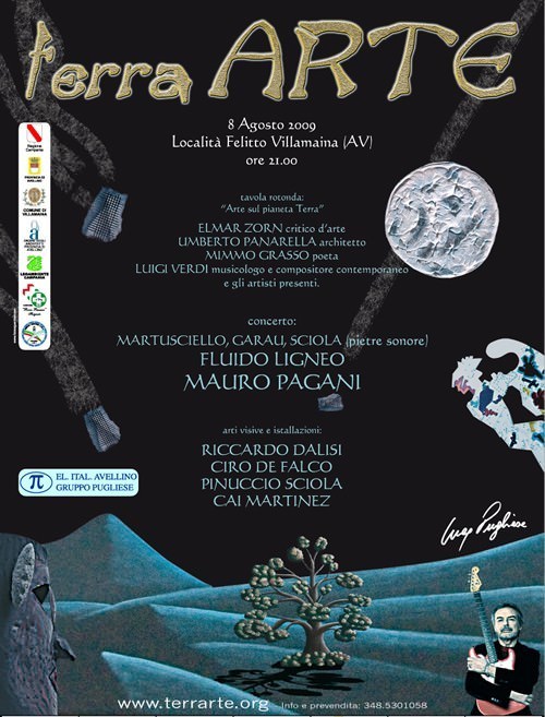La nona edizione della rassegna ideata e diretta da Luca Pugliese, che si terrà sabato 8 agosto a Villamaina (Av, località Felitto) con special guest musicale Mauro Pagani, si aprirà alle ore 21.00 con una tavola rotonda dedicata proprio al tema “Arte sul pianeta Terra”. Vi prenderanno parte, oltre agli artisti ospiti della manifestazione, Elmar Zorn (critico d’arte), Mimmo Grasso (poeta), Umberto Panarella (architetto) – tutti e tre fondatori con Riccardo Dalisi del movimento artistico-culturale “Scavare il futuro” – e Luigi Verdi (compositore contemporaneo e musicologo).