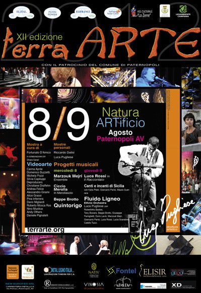 Terra Arte riapre quest’anno il suo sipario, per la seconda volta consecutiva, nel centro storico di Paternopoli (Av). Il popolare evento artistico-musicale ideato e diretto da Luca Pugliese si appresta a celebrare la sua XII edizione, nelle serate dell’8 e del 9 agosto 2012 (ore 21.00), con un palinsesto musicale e un cast di artisti visivi che confermano appieno la collocazione di Terra Arte tra le manifestazioni culturali d’eccellenza del Sud Italia.
