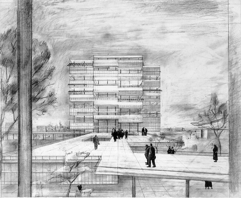 * lo studio del Ristorante per 10.000 persone e dell'annesso padiglione dell'Arredamento della casa e dell'albergo, nell'ambito del progetto per la nuova Fiera campionaria di Milano elaborato nel 1937-38 con P. Bottoni, P. Lingeri, G. Mucchi e M. Pucci.